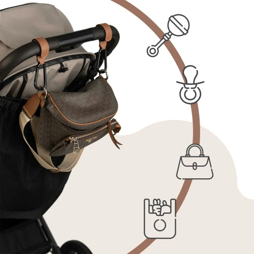 Просто увийте екокожената каишка около дръжката на количката – независимо дали е от пяната или от рамката – и я закрепете със здрава велкро лепенка. Закрепете чанта за памперси, пазаруване или бутилка с вода към металната кука. Цялото нещо се държи здраво и остава на място, дори по време на напрегнати разходки. Сглобяването и разглобяването отнемат секунди, оставяйки ви свободни ръце и удобни във всяка ситуация.