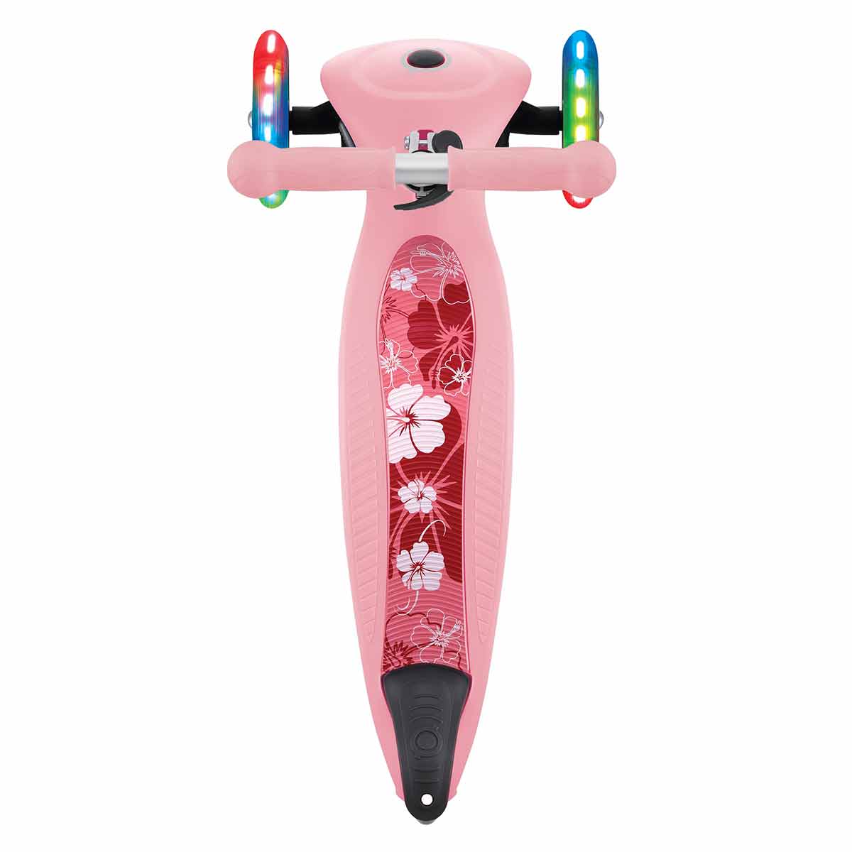 Сгъваема тротинетка Globber Fantasy със светещи колела е подходяща за деца от 2 до 6-годишна възраст и се предлага в пастелно розов цвят и флорален принт.