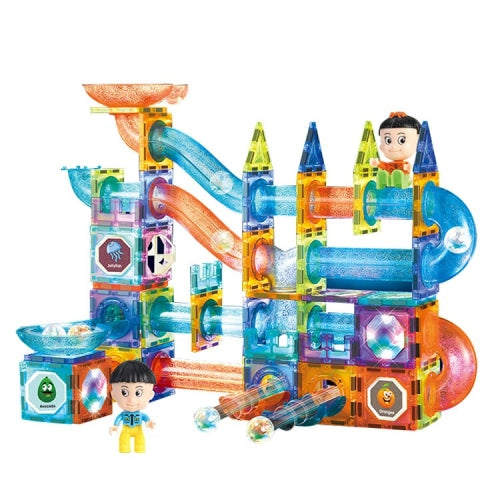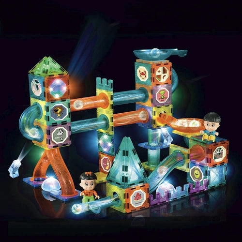 СВЕТЕЩИ СТЪКЛЕНИ МАГНИТНИ ПЛОЧКИ - Новите плочки от 2021 г. със светлини са по-забавни от традиционните магнитни плочки. Децата просто сглобяват магнитните плочки и пръчките заедно, за да създадат състезателни лабиринти. Когато мраморните топки се търкалят, 3-D магнитните лабиринтни ще светнат. Пръчките са полупрозрачни и също могат да бъдат оставени отворени, което позволява на децата да следват топчетата, докато се търкалят нагоре и надолу през пистата.