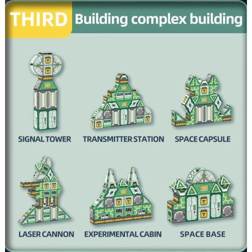 Още с отварянето на кутията, децата ще попаднат в атмосферата на далечна галактика. Конструкторът включва различни геометрични форми – квадратни и триъгълни панели, покривни елементи, врати, арки, прозорци и още много детайли. Всички те са изработени в тематични цветове, напомнящи за космически станции и футуристични бази.