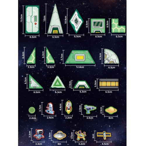 В комплекта са включени и множество декоративни елементи – астронавти, извънземни, сателити, ракети, планети, кораби и други миниатюрни фигури, които придават живот на построените конструкции. Те превръщат всяка игра в истинско космическо приключение.