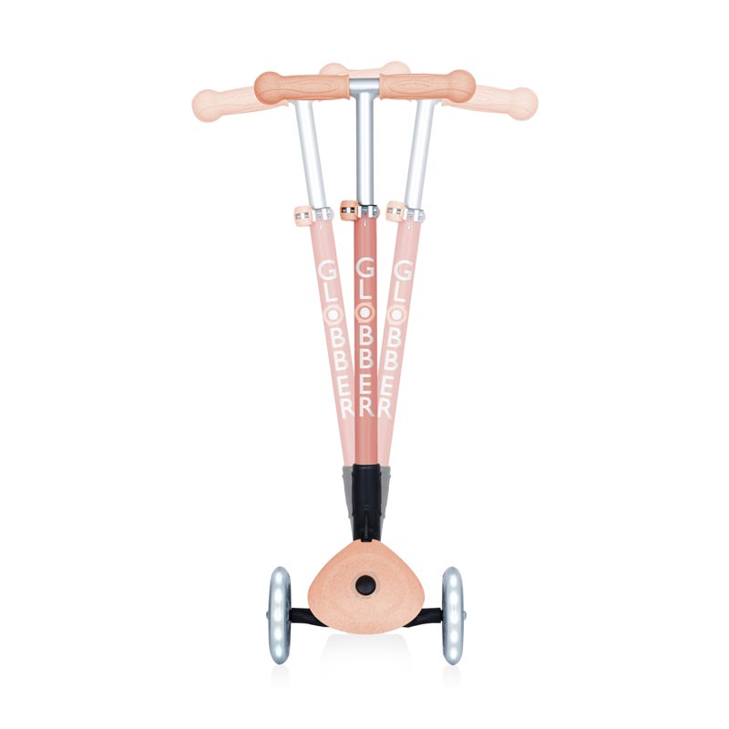 Тази сгъваема еко тротинетка в цвят праскова е снабдена с регулируемо Т-образно кормило, с патентовани системи за заключване и сгъване, както и със светещи колела, които работят без батерии.