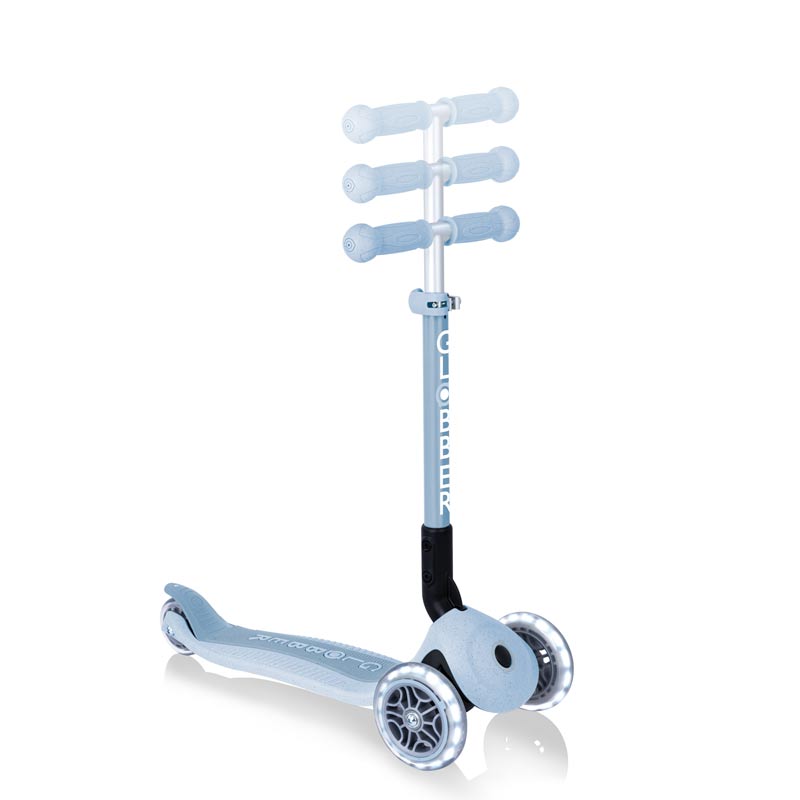 Проектирана с мисъл както за околната среда, така и за забавлението, тротинетката от серията JUNIOR FOLDABLE LIGHTS ECOLOGIC на Globber се предлага и със светещи колела без батерии, които работят посредством движението на вашето дете. Колкото по-бързо се движи то с нея, толкова по-ярко ще свети тя!