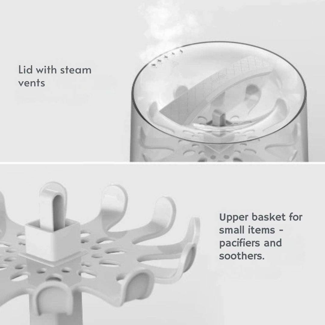 Ултрабърз и безопасен, парният стерилизатор SteriEasy стерилизира до 6 шишета, помпи за кърма и аксесоари само за 6 минути, поддържайки съдържанието стерилно до 24 часа.