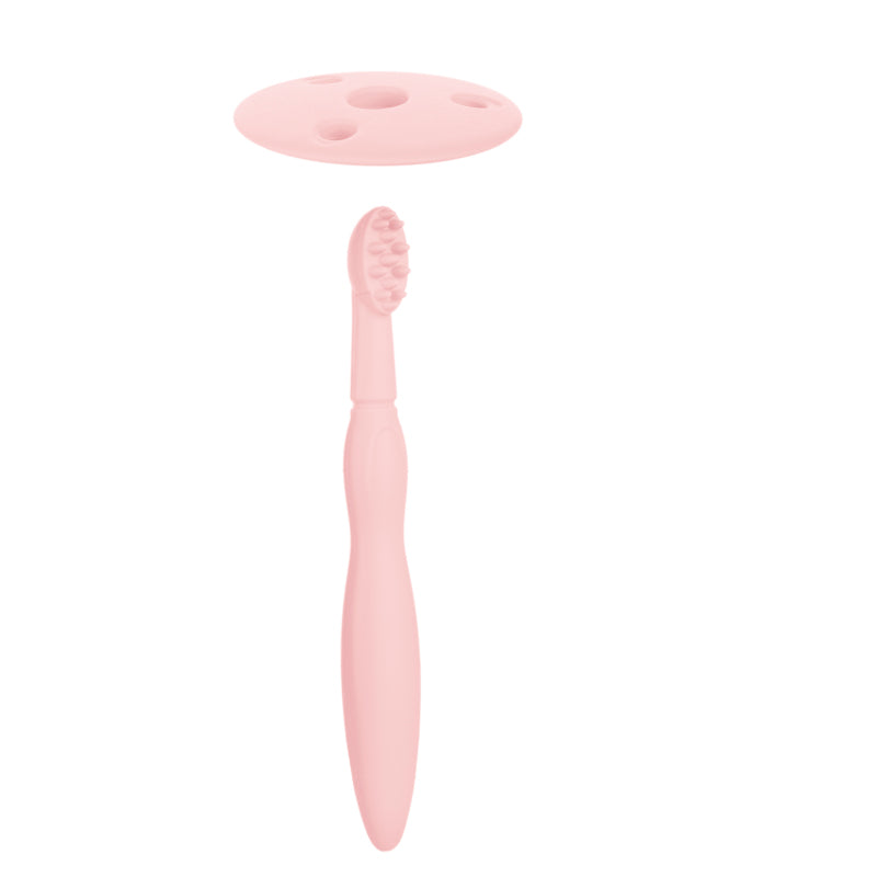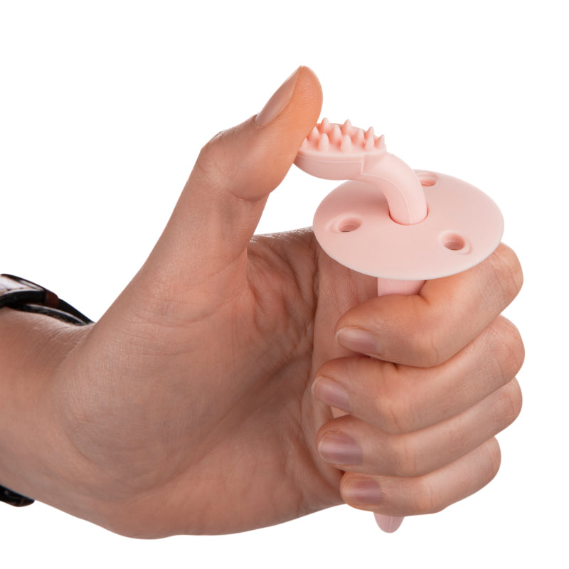 Перфектна за започване на приключението с четка за най-малките деца. Изработена от мек и безопасен силикон, тя не дразни деликатните венци на бебетата и гарантира цялостно почистване на първите зъби. Специален щит предотвратява вкарването на четката твърде дълбоко в устата на детето. За деца, които все още нямат зъби, четката може да се използва като чесалка, за масаж и ежедневна хигиена на венците. Охлаждането в хладилник преди употреба ще донесе облекчение по време на периода на никнене на зъби.