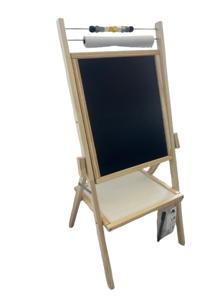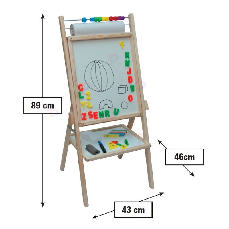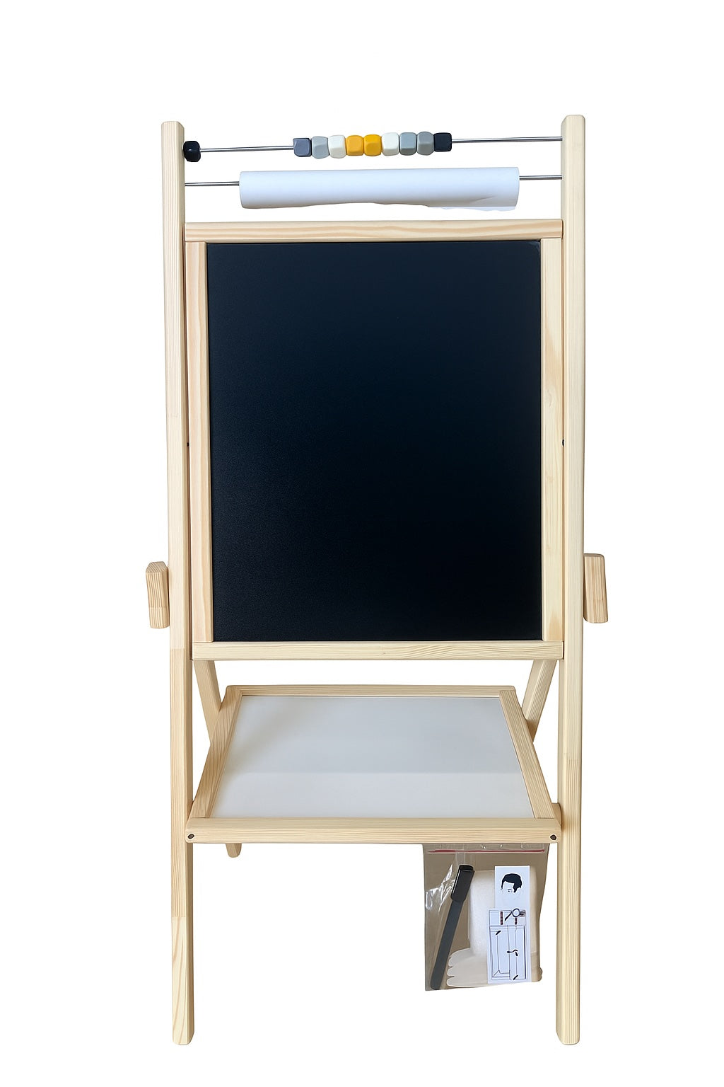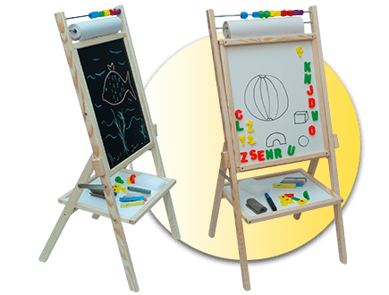Едната страна е бяла магнитна повърхност, подходяща за писане с маркери и подреждане на магнитни букви или цифри, а другата – черна дъска, на която малките художници могат да творят с тебешир.