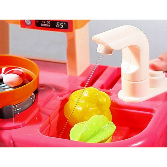 Детска кухня за ролеви игри. С тях детето развива въображение като същевременно му доставят много забавление. С тази кухня детето ще се почувства като истински готвач като готви ястия, които харесва. Комплектът включва 36 аксесоара, които не само ще зарадват малкото дете, но и ще развият неговите двигателни умения.  Комплектът включва кухня, тенджера с капак, тиган, купа, черна дъска, две парчета тебешир, суха гъба за изтриване, чаша, три чинийки, кренвирши, пържено яйце, скариди, парче чушка, парче морков, лист маруля, грах, черен пипер, сол, мляко, горчица, кетчуп, домат, захарница с чаена лъжичка, две малки лъжички, вилица, нож, черпак, гевгир, голям нож за кълцане и шпатула за месо. Освен това кухнята има: сушилня за измити съдове, два котлона със звуци и светлини, хладилник с отваряща се врата, работещ кран за вода. Водата е в затворен кръг, пълни се като се напълни мивката и изтича от крана чрез натискане на помпата. Кухнята има два котлона. И от двата греят светлини и издават звуци. Има две копчета, за да ги пуснем. След включване на първото копче, първият котлона се включва, осветлението свети. Всичко това е придружено от шума на вряща вода. Второто копче стартира втория котлон, светлините светват и се чува звук от пържене. Необходими батерии: 3 х АА, 1.5V (не са включени в комплекта). Размер на кухнята - 63 x 45.5 x 22 cm Технически данни: Общо обемно тегло с опаковка в кг: 1.590000 Специални цени: Yes Цвят: Розов Изработено от: Метал, Пластмаса Възраст: Над 3 години, Над 4 години, Над 5 години Подходящо за: За момиченца