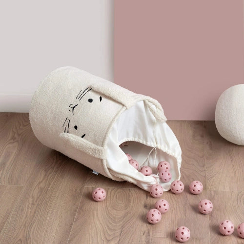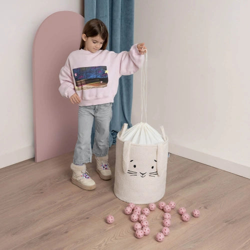 С капацитет от 43 литра кошът е подходящ за използване в детска стая, хол, спалня или баня, като осигурява удобно съхранение на играчки, текстил и аксесоари, без да заема излишно пространство. Външният слой е изработен от мек, пухкав букле плат, който естествено приканва към допир и взаимодействие. Приветливият дизайн с животински мотив – очарователното зайче – помага за изграждане на емоционална връзка с продукта и превръща подреждането в забавление, а не в задължение.
