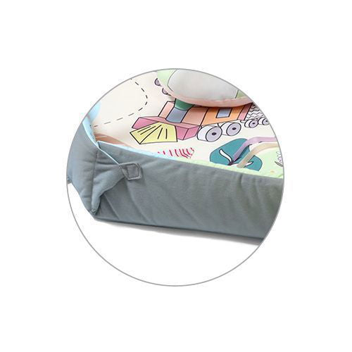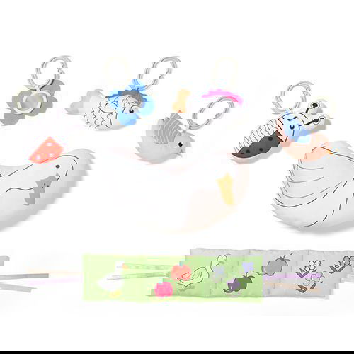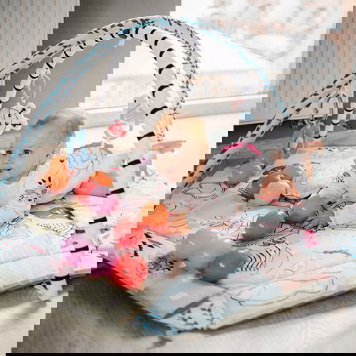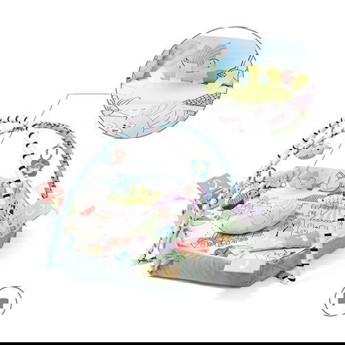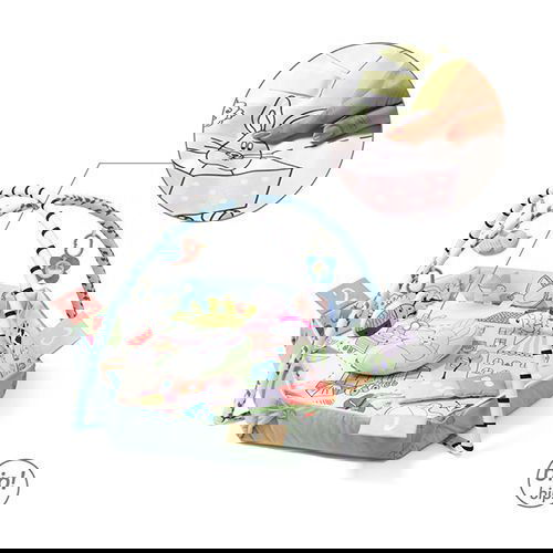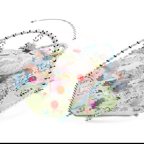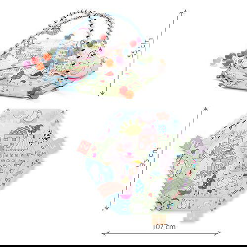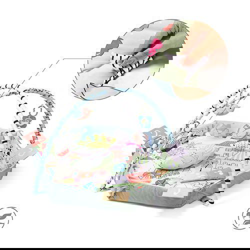 Нашето килимче е не само място за игра, но и място за учене. Подложката съдържа шумолещи и скърцащи елементи, стърчащи етикети, висящи играчки и сгъваема книга. Благодарение на това вашето мъниче развива двигателните си умения, стимулира зрението, слуха и упражнява когнитивните умения.