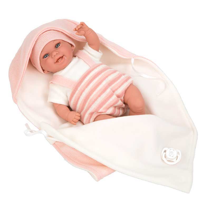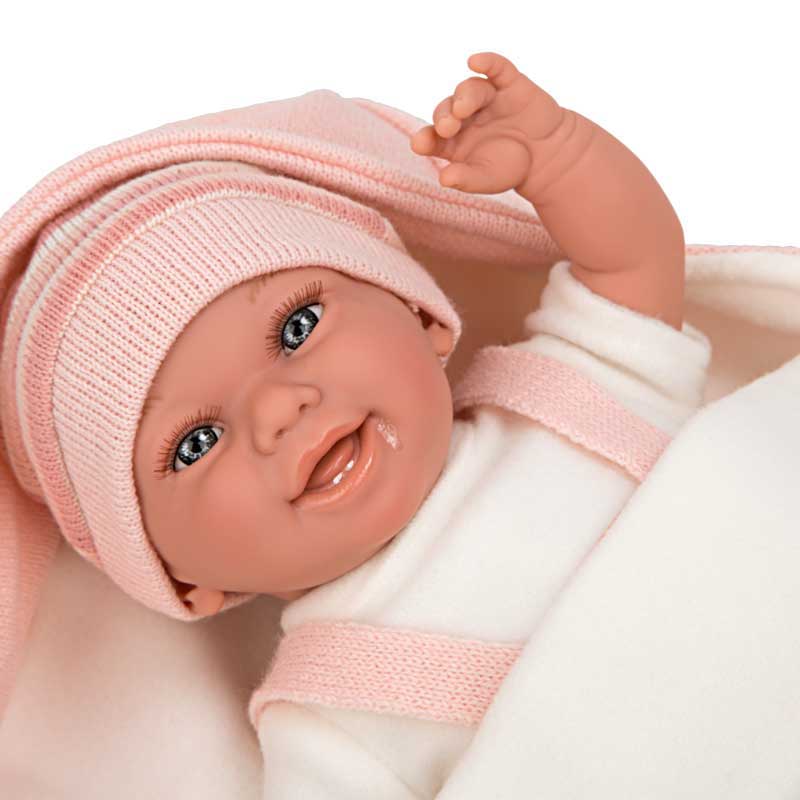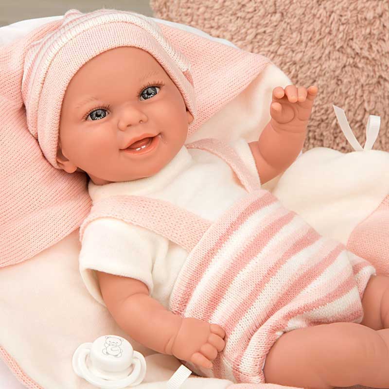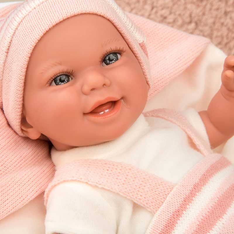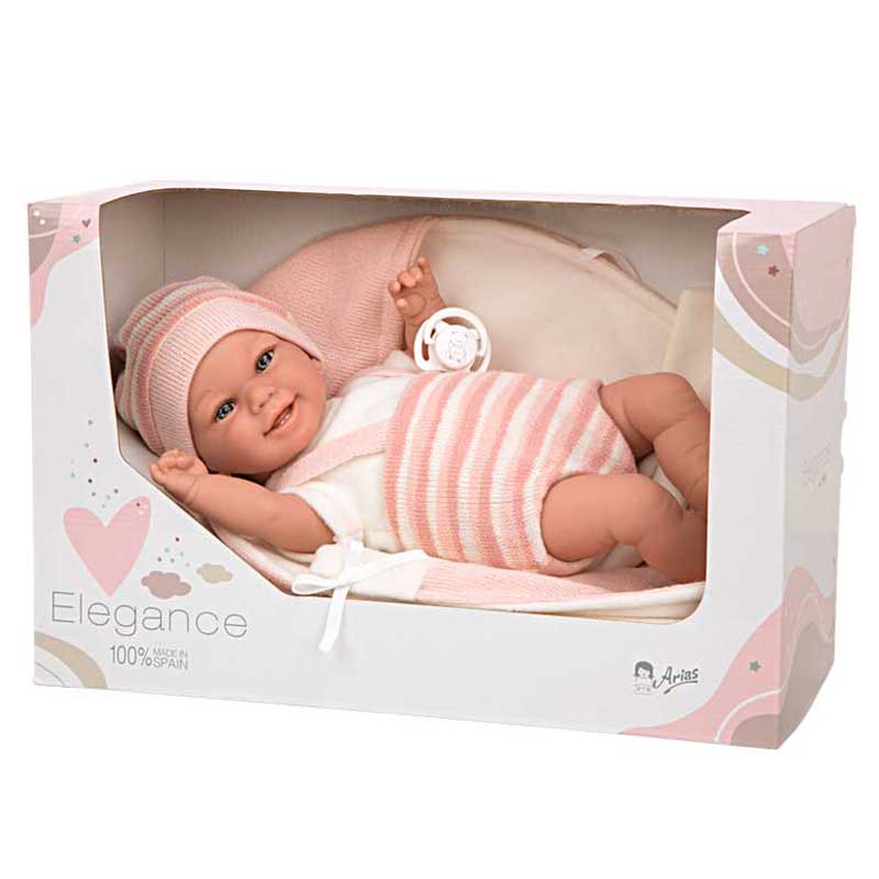 Всяка малка принцеса ще се влюби в живата кукла-бебе Роса от колекцията "Elegance" на испанската марка Arias. Ръчно изработена и с реални размери като истинско бебе, тя ще донесе радост и незабравими мигове в игрите. Тялото ѝ е меко, а крайниците и главичката ѝ са от висококачествен винил с аромат на ванилия. Специално внимание е отделено на деликатните черти на лицето, ръчно рисуваните очи и меката, реалистична кожа. Бебе Роса е облечена в бяла блузка и розово плетено гащеризонче на райе с шапчица. Всяко малко момиченце ще се забавлява да играе с нея, да я гушка и приспива. Ще бъде неин верен другар в игрите и разходките в парка.