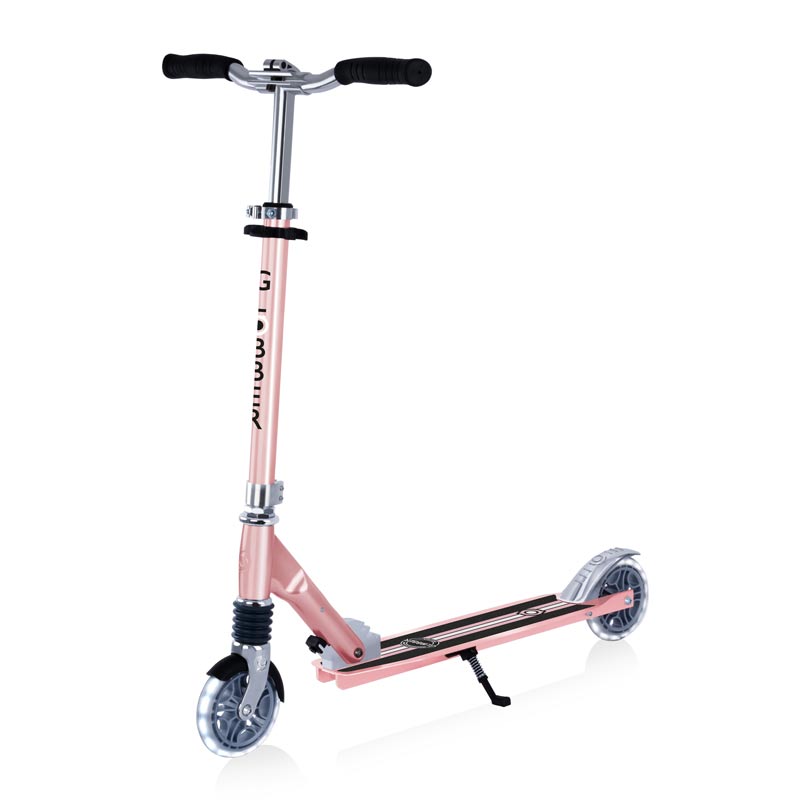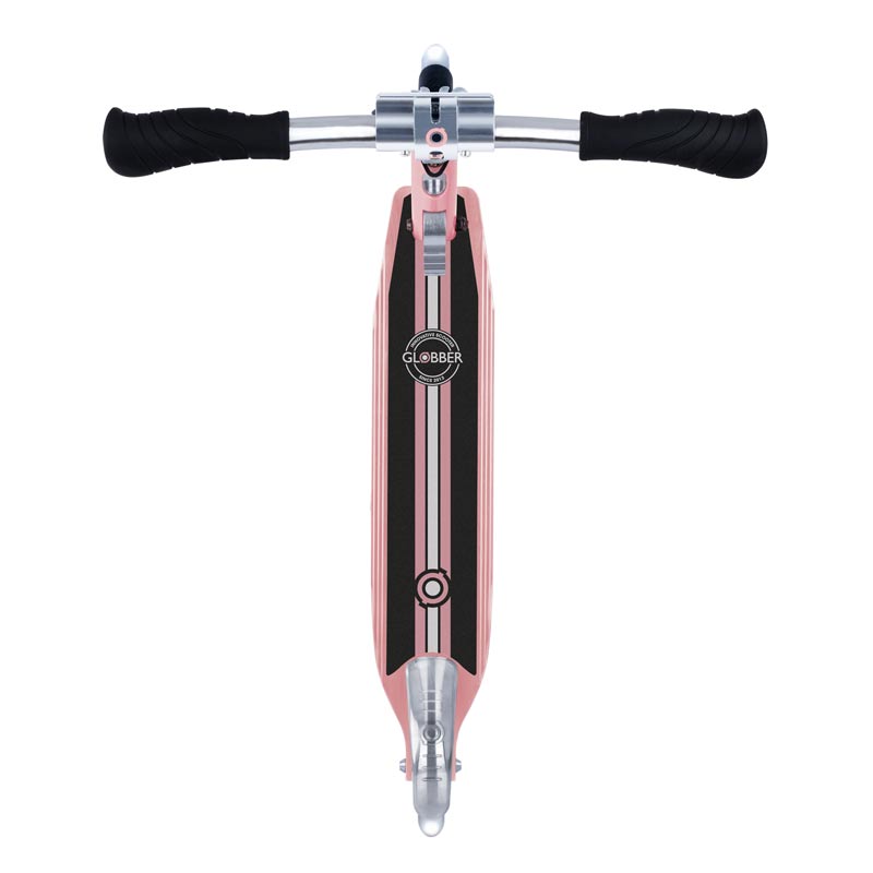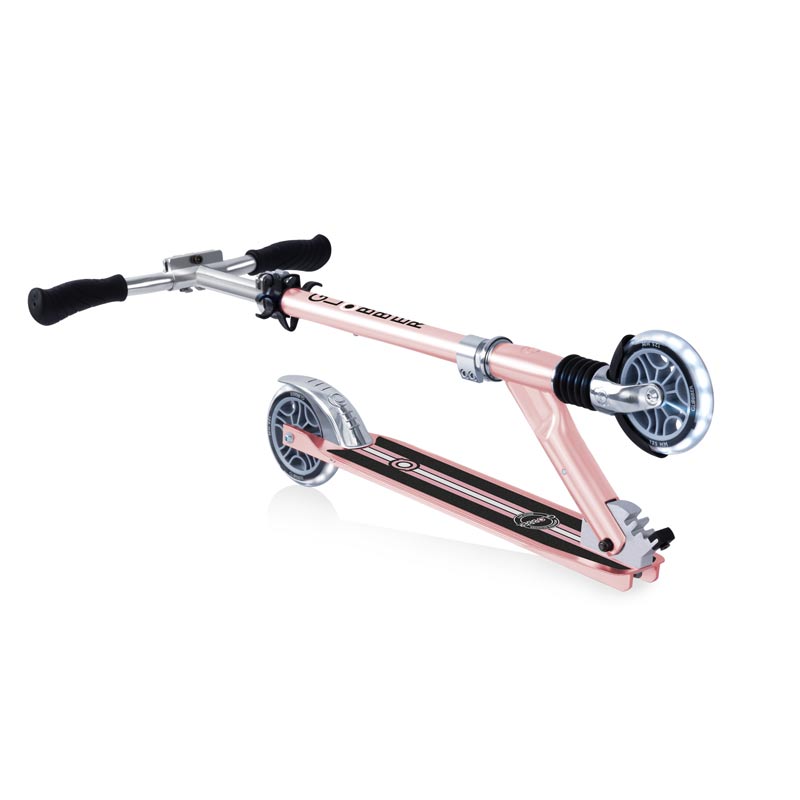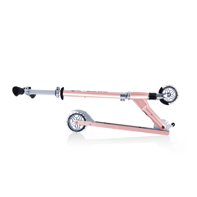 Стилна, елегантна и лека, тази розово златна метална сгъваема тротинетка с две колела от серията FLOW ELEMENT COMFORT LIGHTS е оборудвана с патентована система за сгъване, вградено предно окачване, ярки хромирани цветове, Т-образно кормило с 4 степени на регулиране на височината, сгъваеми ръкохватки, модерно противоплъзгащо покритие, стабилна задна спирачка и 125-милиметрови светещи колела с висока степен на отскок.
