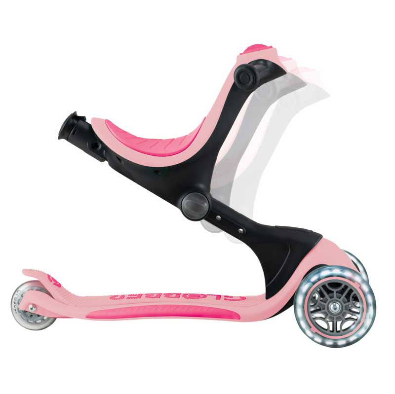 Триколката има патентована система за блокиране на управлението, която е ексклузивна за Globber. Предните колела са фиксирани във вертикално движение нагоре-надолу, което позволява на детето да упражнява баланс и да придобие увереност при карането на скутер. След като е готово, просто освободете бутона за заключване на управлението, за да може то да започне да кара своята светеща триколка само!