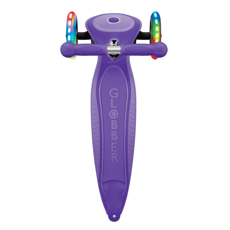 - Тротинетка със светещи колела и патентована система за сгъване на Globber с безопасен и леснодостъпен бутон, чрез който лесно се преминава в режим на количка. Удобен за пренасяне и съхраняване след игра!