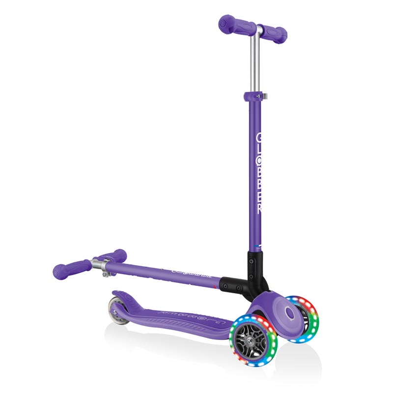 Новата детска триколка със светещи колела PRIMO FOLDABLE PLUS LIGHTS е оборудвана с патентовани системи за сгъване и за заключване на управлението и Т-образно кормило с 4 степени на регулиране на височината. Тротинетките от тази серия са предназначени за малчугани на възраст от 3 до 9+ години, с височина 95-130 см.