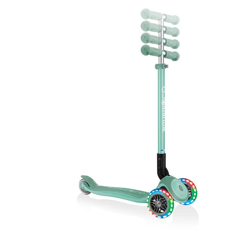 Новата сгъваема триколка за деца PRIMO FOLDABLE PLUS LIGHTS е оборудвана с LED светещи колела, патентовани системи за сгъване и за заключване на управлението и Т-образно кормило с 4 степени на регулиране на височината. Тротинетките от тази серия са предназначени за малчугани на възраст от 3 до 9+ години, с височина 95-130 см.