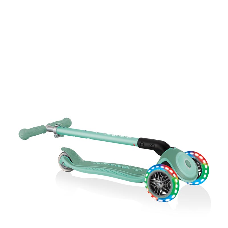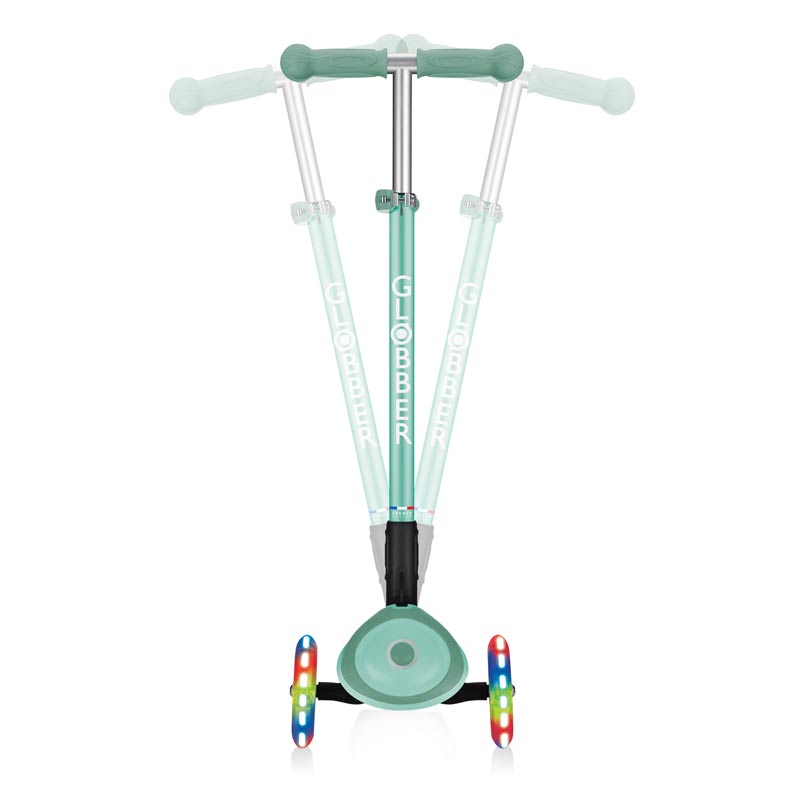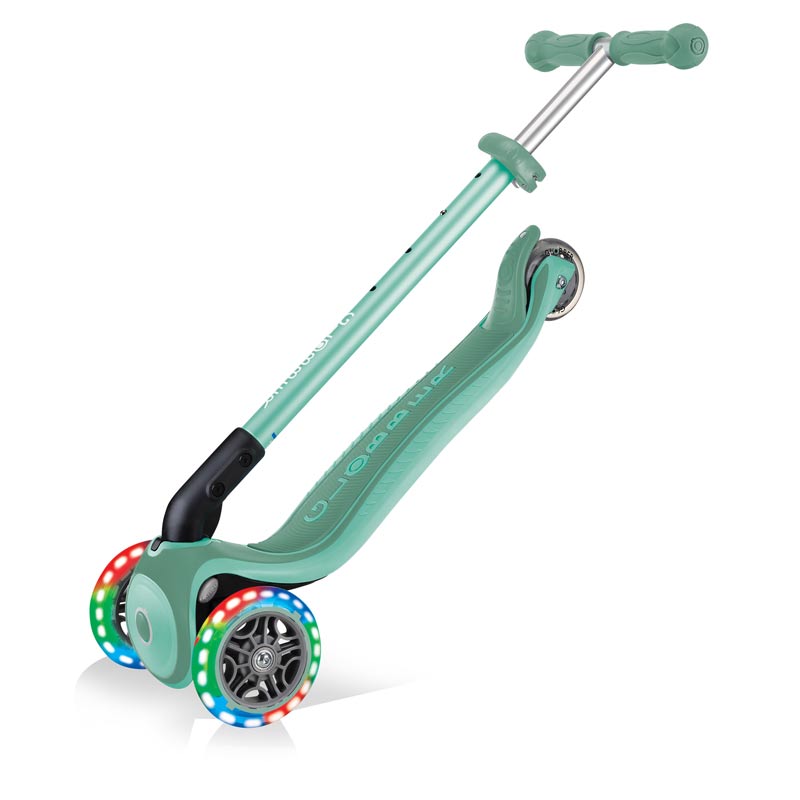 - Тротинетка със светещи колела и патентована система за сгъване на Globber с безопасен и леснодостъпен бутон, чрез който лесно се преминава в режим на количка. Удобен за пренасяне и съхраняване след игра!