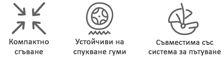 Сгъването и съхранението на вашата количка е толкова лесно, че ви трябва само една ръка. Точно това, от което се нуждаете по време на разходка с лесно качване и слизане, сгъване и настройки.