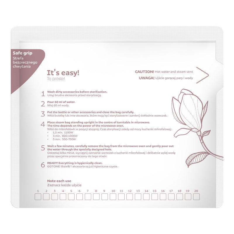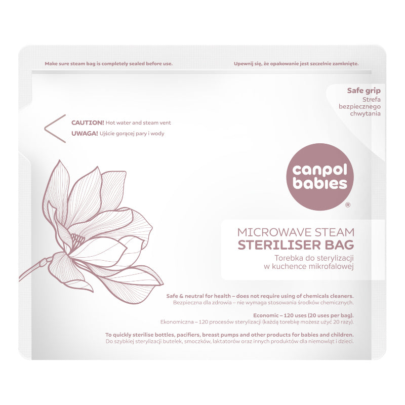 Пликчетата за стерилизиране в микровълнова фурна Canpol babies са лесен, бърз и безопасен начин за стерилизиране на шишета, залъгалки, части от помпи за кърма и други бебешки и детски продукти.Стерилизацията е безопасна, без химикали и отнема само 90 секунди.