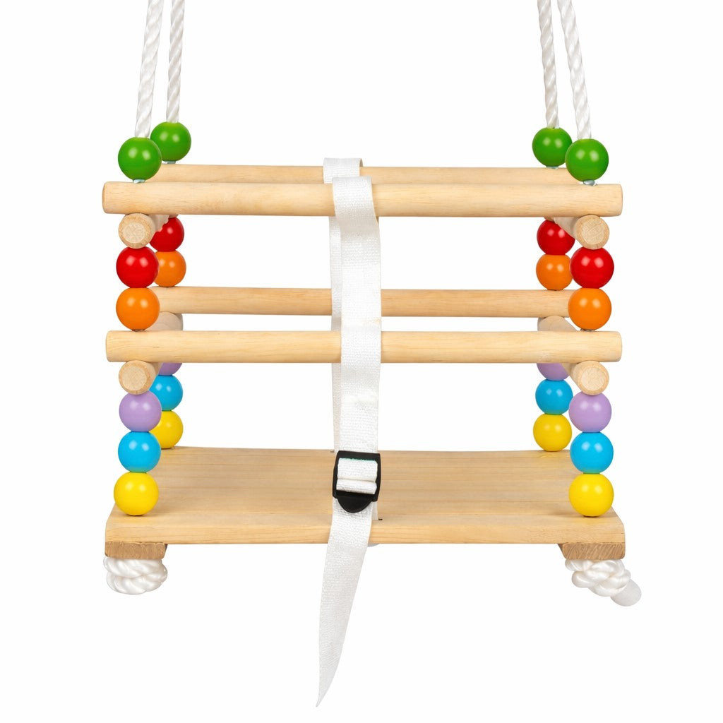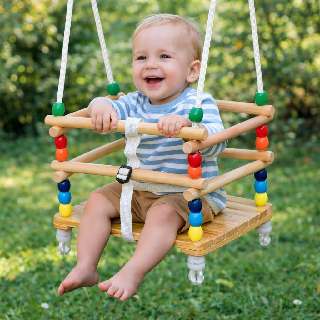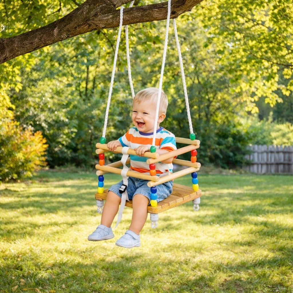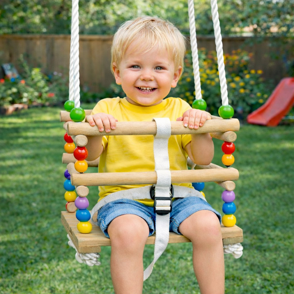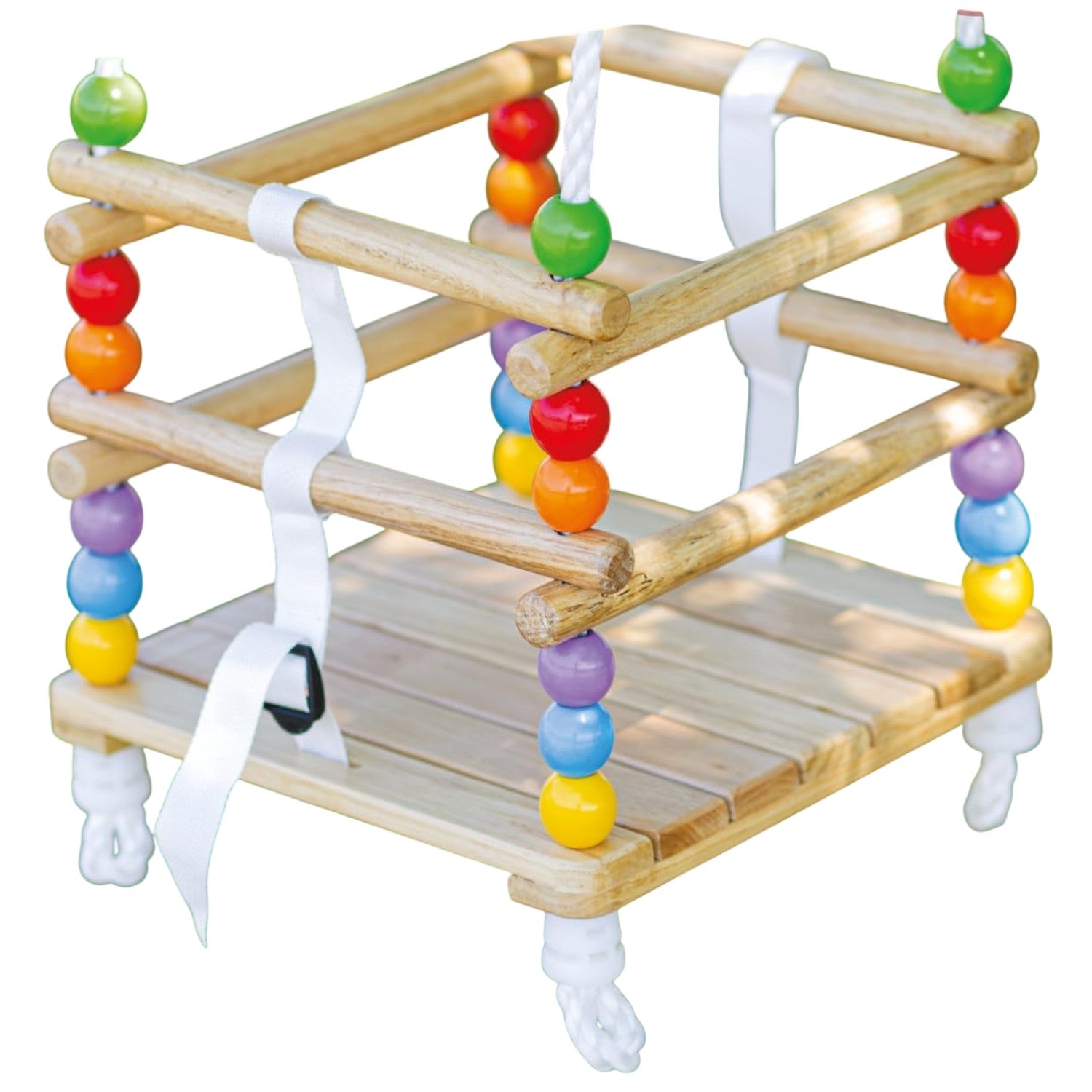 Люлката разполага с предпазни дървени бордове, които обгръщат детето и предотвратяват изплъзване, както и с регулируем обезопасителен колан за стабилна и безопасна позиция по време на люлеене. Здравите въжета осигуряват надеждно окачване и устойчивост при употреба.