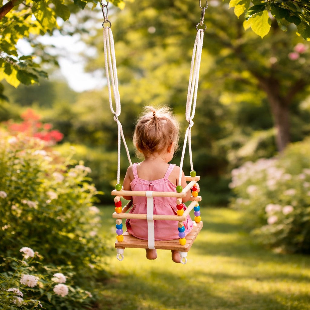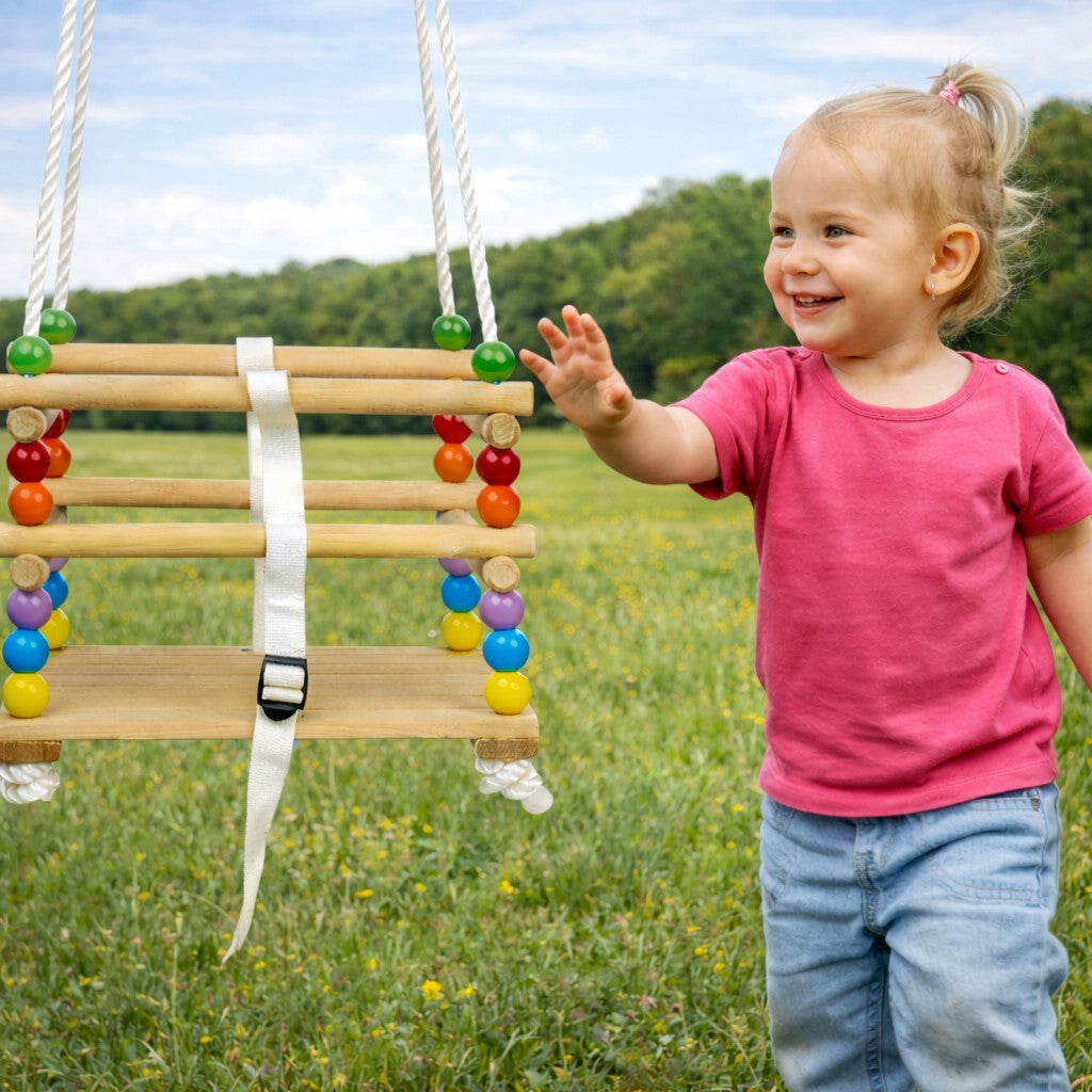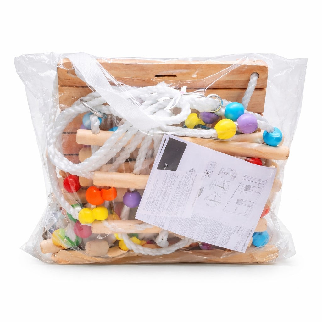 Декоративните дървени мъниста придават атрактивен външен вид и подпомагат развитието на фината моторика, координацията ръка–око и сензорното възприятие. Люлката е не само забавление, но и полезна играчка за развитие.