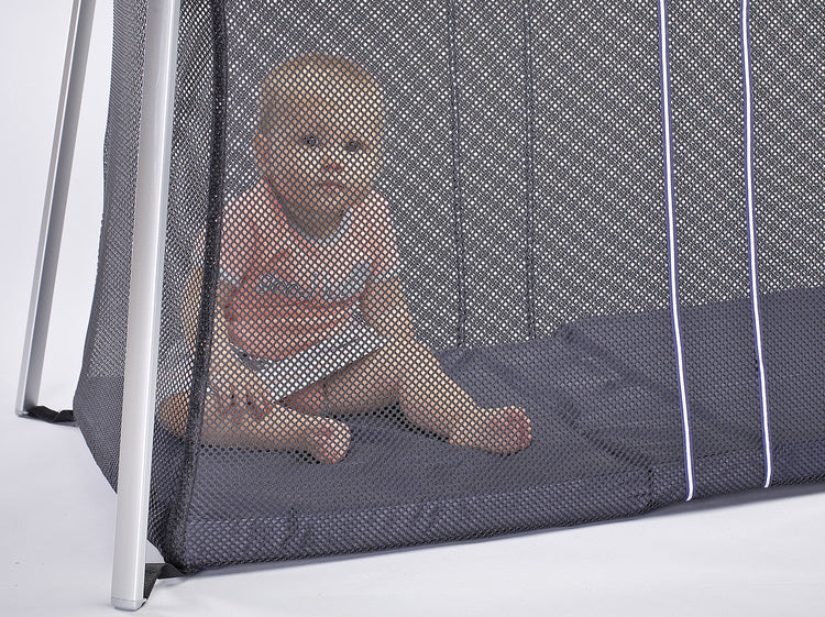 Лесна за поставяне кошара, която може да се разгъне буквално за няколко секунди. Тя е лека и компактна. Алуминиевата рамка и използваните материали й придават елегантен вид. Предоставя подходящо пространство за почивка и игра. В комплекта има и удобен матрак . Лесно и безстресово, кошарата съдържа повече пространство и допълнително време за детето. И всичко това представено в елегантна форма.