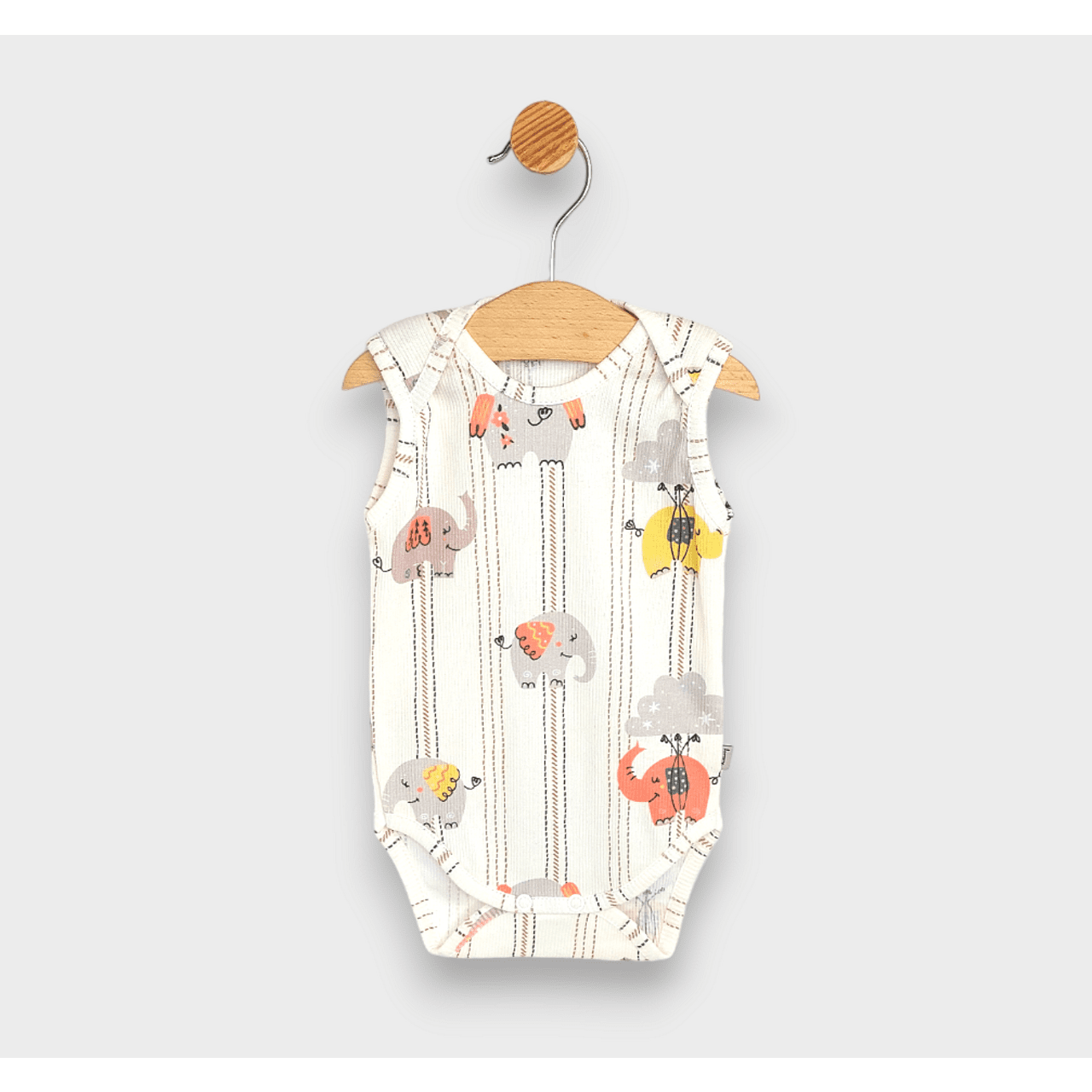 Защо да не направим първите стъпки на Вашето малко съкровище още по-цветни и весели? Представяме Ви "Rainy Premium Бебешко боди-потник Слончета 56 - 80см. " - перфектният избор за стилни и комфортни ежедневни приключения.