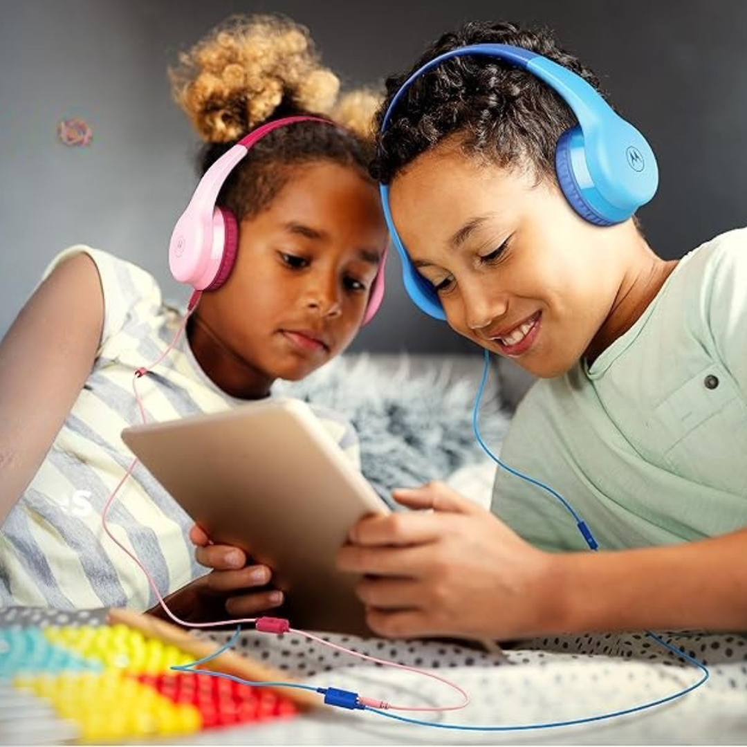 Сподели музиката Слушането на музика, детски предавания и аудиокниги е по-забавно заедно. Детските слушалки MOTO JR300 се предлагат с аудио кабел и разклонител, към който можете да свържете до 2 слушалки едновременно.