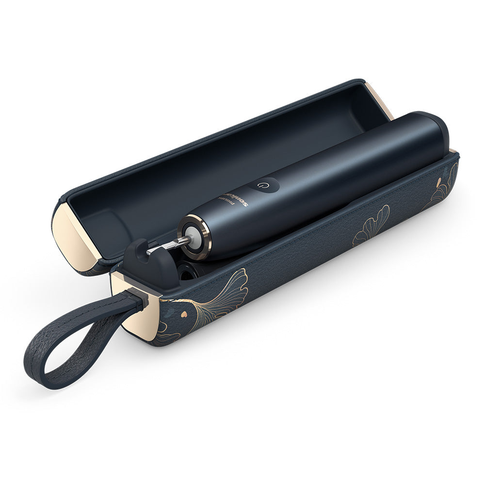 Лимитирана серия на най-усъвършенстваната четка за зъби Philips Sonicare Prestige SenseIQ 9900 с изключително стилен и компактен дизайн на специалния твърд калъф с вградено USB захранване в „среднощно синьо“ с листа от гинко билоба в графичен стил и 2 накрайника Premium All-in-One