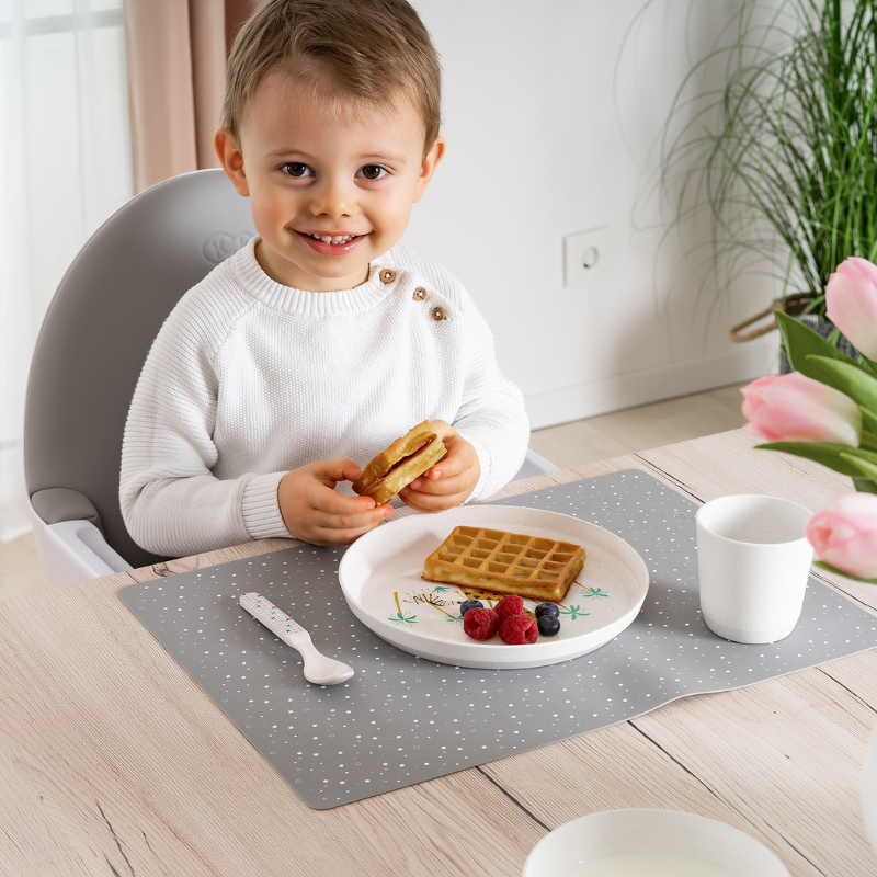 Е устойчива на приплъзване, сигурно се закрепва към масата. Гъвкава и лесна за почистване, тя е подходяща както за хранене, така и за игра. Материалът е здрав и дълготраен, може да се пере в пералня.