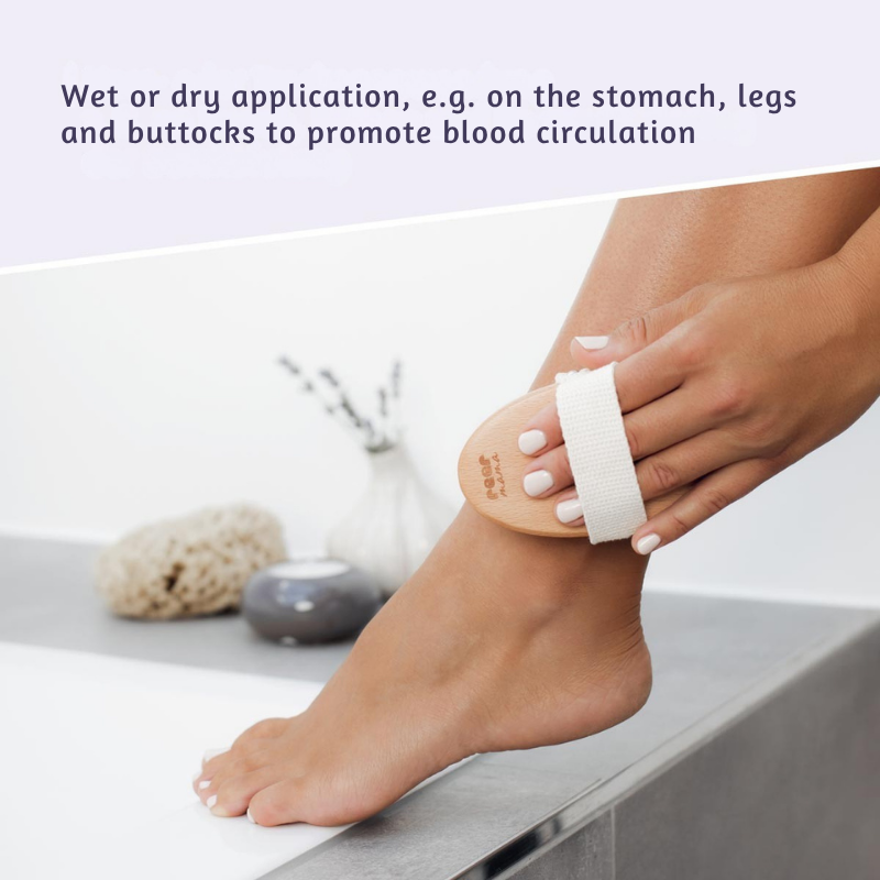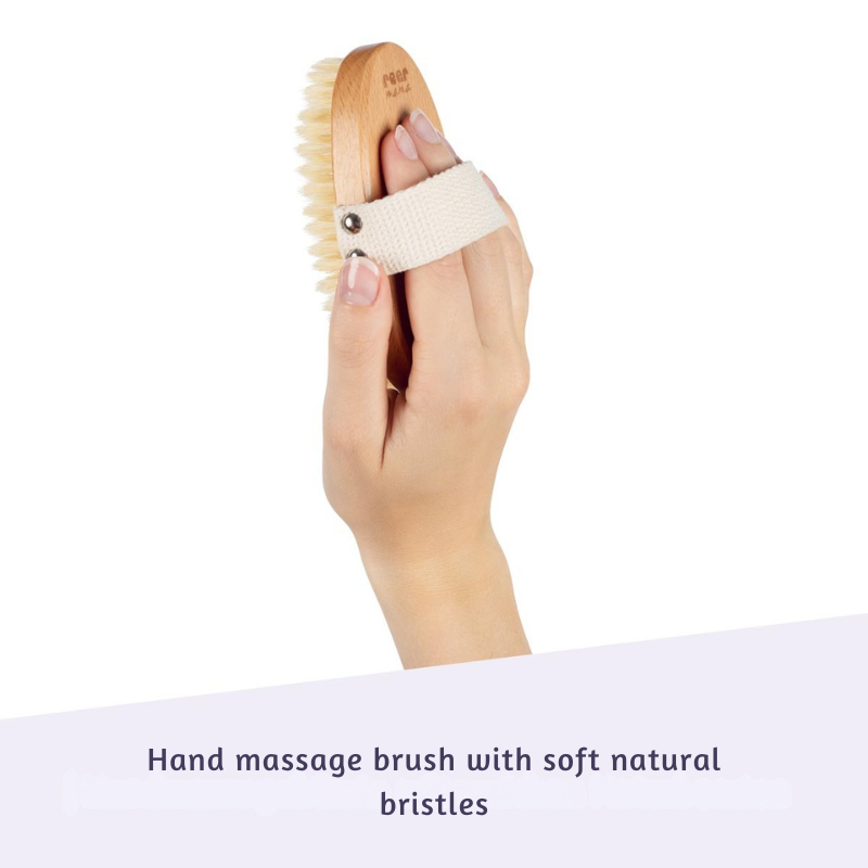 Успокояващият масаж по време на бременност винаги е добра идея. Масажната четка, с меките си естествени влакна, осигурява интензивно, но нежно третиране на кожата – като скраб, само че по-нежно. Въпреки това, жените, чиято кожа реагира чувствително дори на сух масаж, могат да използват четката в комбинация с вода за още по-нежно изживяване. Четката няма пластмасови издатини; масажът се осигурява единствено от меките естествени влакна.