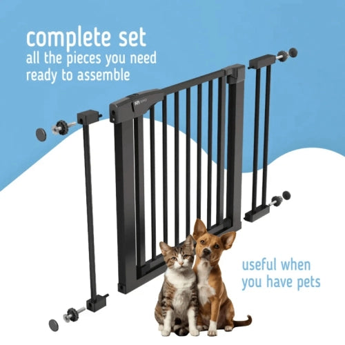 С елегантен черен цвят и стабилна конструкция, вратичката предлага модерен външен вид, който се вписва идеално във всеки интериор – от класически до съвременен стил. Благодарение на разширяващите панели и системата за монтаж чрез натиск, тя се адаптира лесно към различни пространства и се инсталира без пробиване, което я прави подходяща дори за наети жилища.