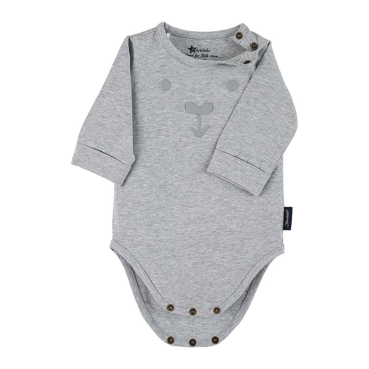 Детско боди с дълъг ръкав, изработено от меко трико в сив цвят и сладка апликаци на мече. Бодито е незаменимо в бебешкото облекло от раждането на Вашето дете. С практичните копчета на рамото, обличането и събличането е детска игра. Детското боди се предлага в размери от 56см. до 92см. и чудесно се съчетава с много други дрехи.