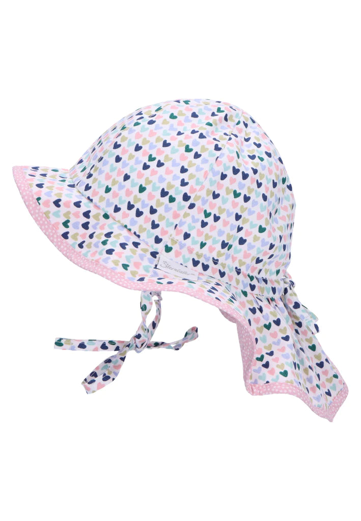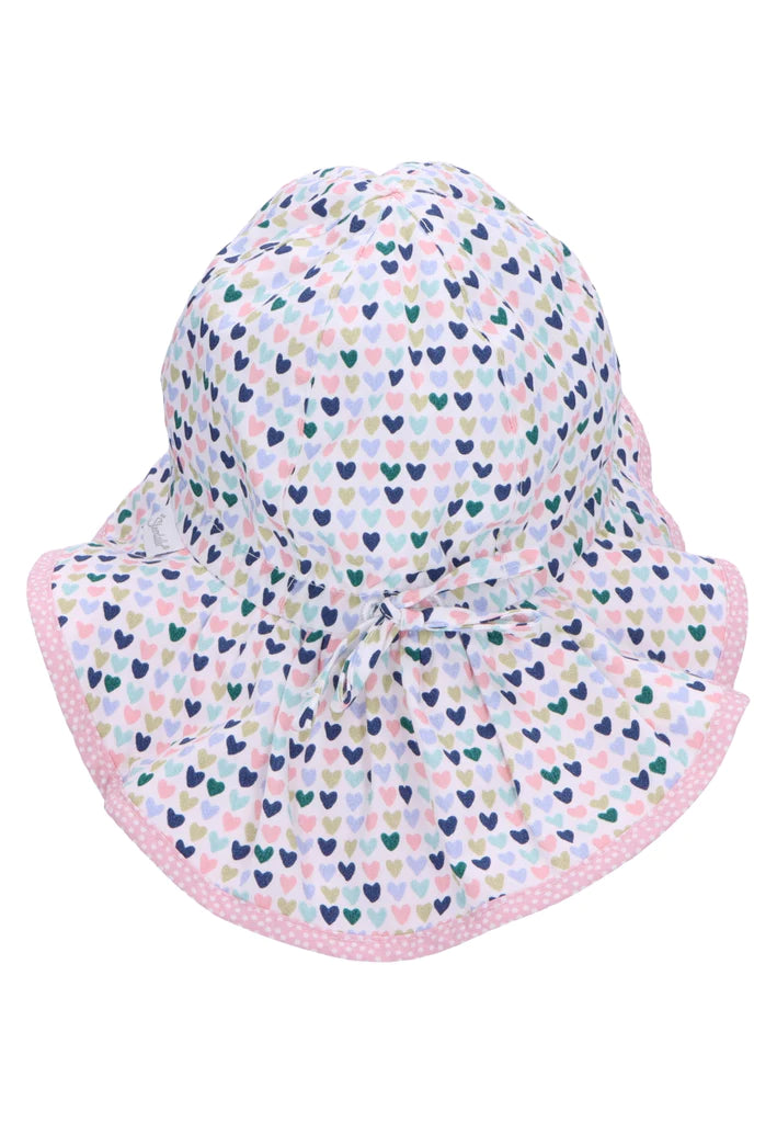 Лятна детска шапка за момичета в размери от 41см. до 51см. Слънцезащитната шапка се предлага  в бяло с принт на  цветни сърца. Моделът на детската шапка дава възможност за допълнително регулиране в зависимост от размера на главата на детето с помощта на връзка. Детската лятна шапка е изработена от 100% памук с UV 50+ защита. Висококачественият материал предлага цялостна защита за чувствителния детски скалп, а периферията пази допълнително детското личице от слънчево изгаряне. Защитете Вашето дете от преките слънчеви лъчи ???? като се доверите на Sterntaler и детските шапки с висока защита срещу ултравиолетовите лъчи!