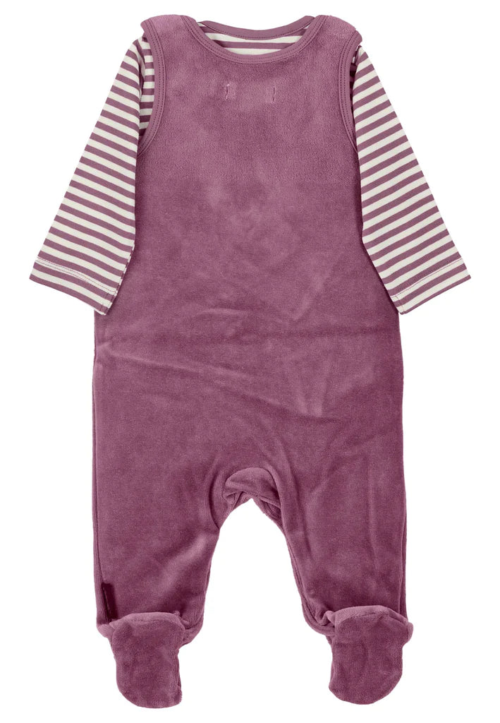 Новороденото бебе има нужда от топлина и сигурност! Не само любящите ръце на мама и татко, но и удобни и щадящи кожата бебешки дрешки трябва да го обгръщат. Перфектен за новородени е нашия бебешки комплект от две части - боди от трико на райе с копчета на раменете и модерен гащеризон с крачета. Удобният и практичен гащеризон е изработен от мек плюш и нежно боди с дълъг ръкав. Със закопчаване на раменцата, за по-удобно и лесно обличане, с тик-так копчета между крачетата за лесна подмяна на пелените и ограничител на крачетата. Дрехите на Sterntaler са създадени с много любов и грижа към новороденото. Всеки детайл е съобразен с нежната бебешка кожа. Дизайна е фин и семпъл, така че да задоволи и най-изискания вкус. Използваните материали са лесни за поддръжка и издръжливи, няма неудобни шевове в областта на гърба.