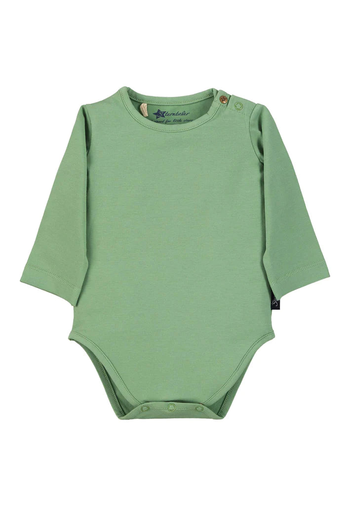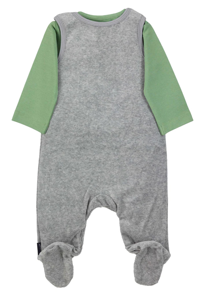 Новороденото бебе има нужда от топлина и сигурност! Не само любящите ръце на мама и татко, но и удобни и щадящи кожата бебешки дрешки трябва да го обгръщат. Перфектен за новородени е нашия бебешки комплект от две части - боди от трико с копчета на раменете и модерен  гащеризон с крачета. Удобният и практичен гащеризон е изработен от мек плюш и нежно боди с дълъг ръкав. Със закопчаване на раменцата, за по-удобно и лесно обличане, с тик-так копчета между крачетата за лесна подмяна на пелените и ограничител на крачетата. Дрехите на Sterntaler са създадени с много любов и грижа към новороденото. Всеки детайл е съобразен с нежната бебешка кожа. Дизайна е фин и семпъл, така че да задоволи и най-изискания вкус. Използваните материали са лесни за поддръжка и издръжливи, няма неудобни шевове в областта на гърба.