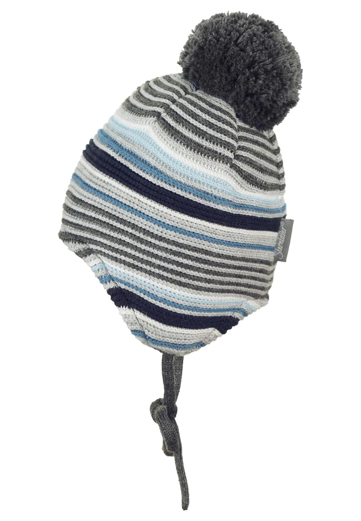 Пухкавата плетена шапка е изработена от памук (органичен) и впечатлява с разнообразието си от цветове. Шапката има страхотна кройка, която пасва перфектно на главата на детето. Практичните наушници покриват оптимално чувствителните уши. Връзките осигуряват допълнителна опора и предотвратяват свличането или падането на шапката. Лесна за поставяне и оптимално приляга към главата на детето. Мека материя и топла подплата за да пази още по-добре през есенните и зимни, ветровити дни.