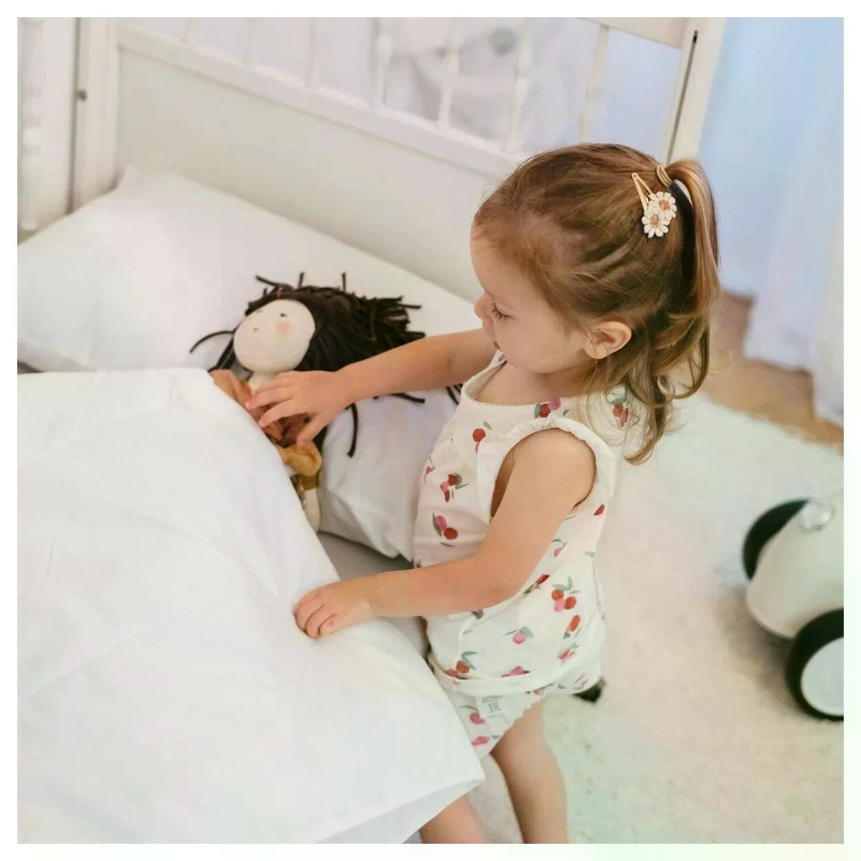 Калъфът е изработен от органично отглеждан памук, без използване на химикали. Материята е хипоалергенна и щадяща към чувствителната детска кожа, като същевременно осигурява добра циркулация на въздуха и естествено усещане за мекота.