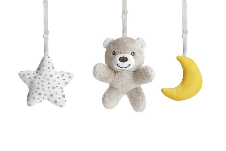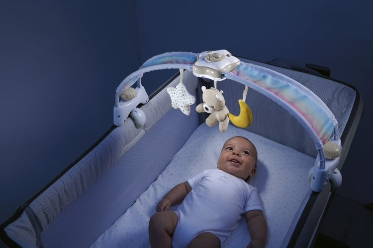 - Panou pentru pătuț 0-6 luni cu melodii clasice relaxante, jucării moi atașate și o lumină proiectoare albă moale în formă de stea. În ultimele 5 minute ale fiecărui ciclu, muzica se estompează și lumina începe să se stingă ușor până se stinge, ajutând bebelușul să se relaxeze.