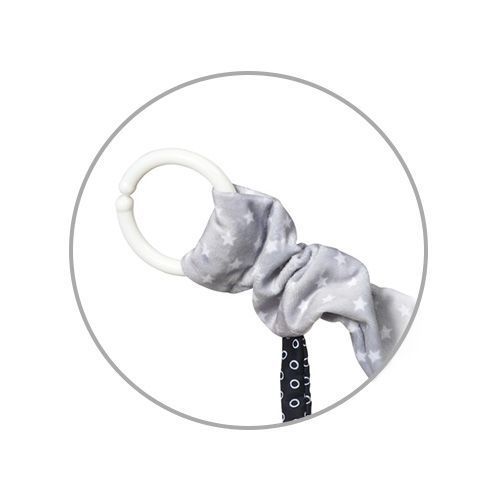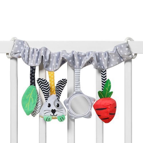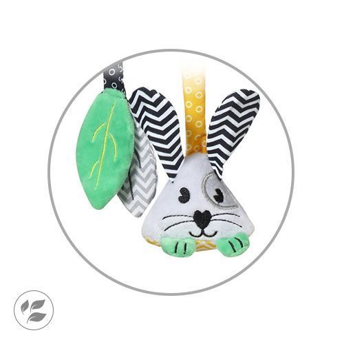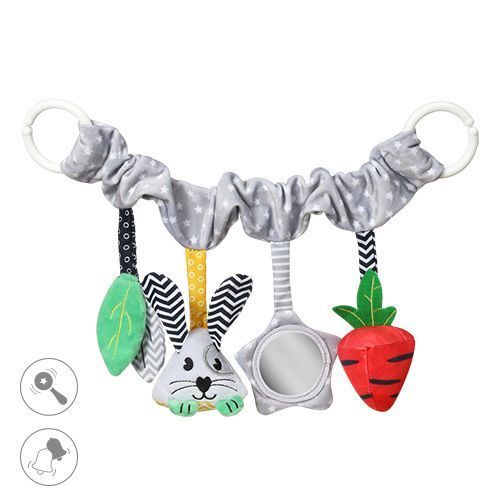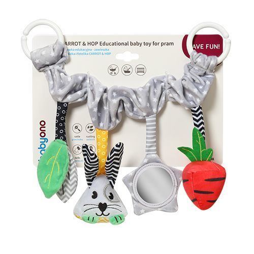 O jucărie educativă pentru cărucior cu elemente contrastante va face lumea copilului dumneavoastră mai diversă, sprijinindu-i coordonarea vizual-auditivă și coordonarea mână-ochi. Atașați-o la un cărucior, leagăn sau scaun auto pentru a vă distra copilul în timp ce mergeți sau călătoriți. Jucăriei îi sunt atașate o frunză foșnitoare și un iepure care se mișcă, cu urechi în culori contrastante , acoperit cu un material foarte plăcut la atingere. Alte elemente oferite copilului dumneavoastră includ o oglindă și un morcov care se mișcă ușor. Selecția interesantă de elemente, plăcute la atingere, atrag atenția bebelușului prin diversele lor modele și culori. Acestea îi permit bebelușului dumneavoastră să descopere lumea și să își îmbunătățească abilitățile motorii prin joacă.