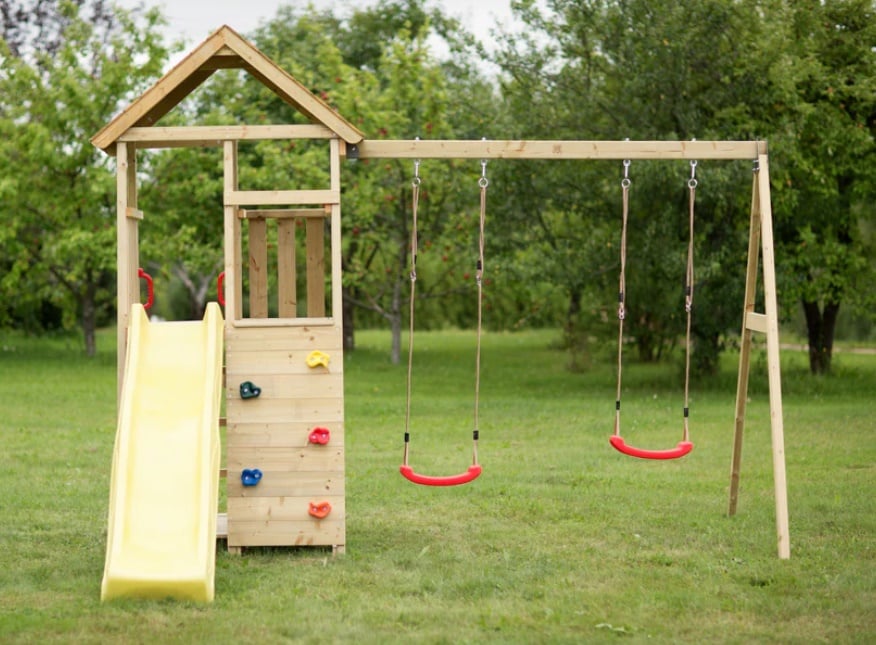 J9 Junior градинска площадка - отлично оборудвана (WE-300 детска площадка + WE-509Y пързалка + WE-314 маса за пикник и малък пясъчник + WE-313 двойна люлка)