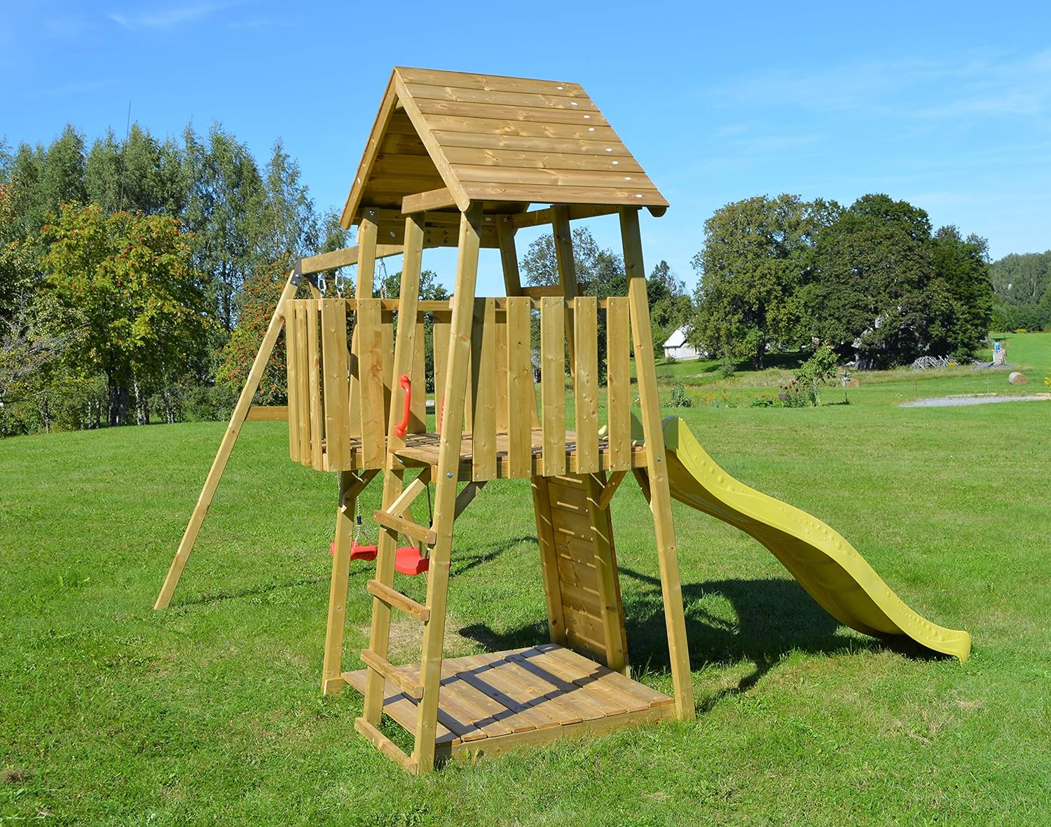 Нашата кула за игра е изработена от висококачествена, импрегнирана под налягане северен смърч/бор. Цялата използвана дървесина идва от FSC сертифицирани гори. Издръжливото дърво е устойчиво на атмосферни влияния и гниене. Площадката отговаря на европейския стандарт EN-71.