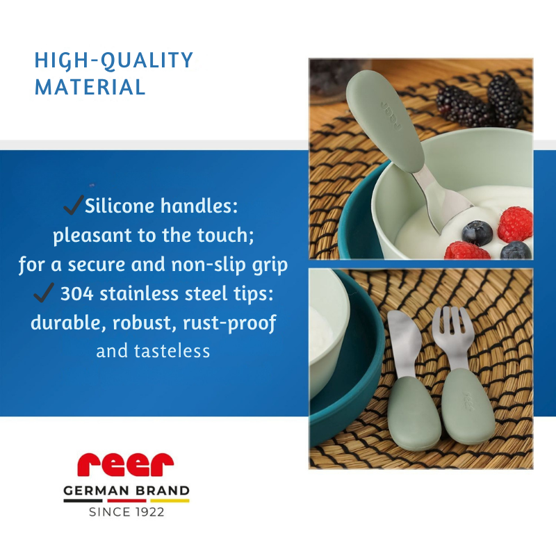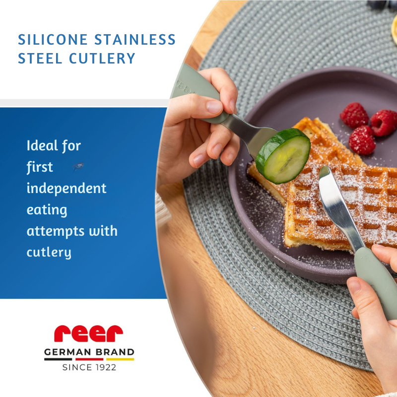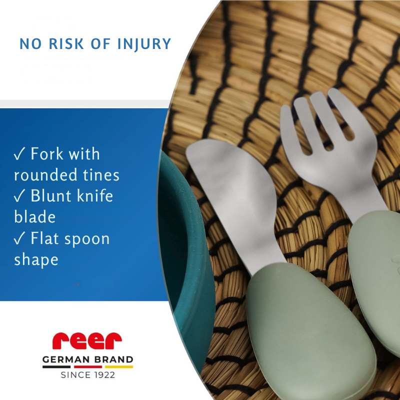 Децата искат да изследват света – и това включва самостоятелно хранене с прибори за хранене. Обикновените прибори за хранене обаче често са твърде големи, твърде тежки или хлъзгави за малките ръчички. С комплекта прибори за хранене, специално разработен за деца от reer – състоящ се от нож, вилица и лъжица – малките могат игриво да практикуват използването на лъжица, вилица и нож.