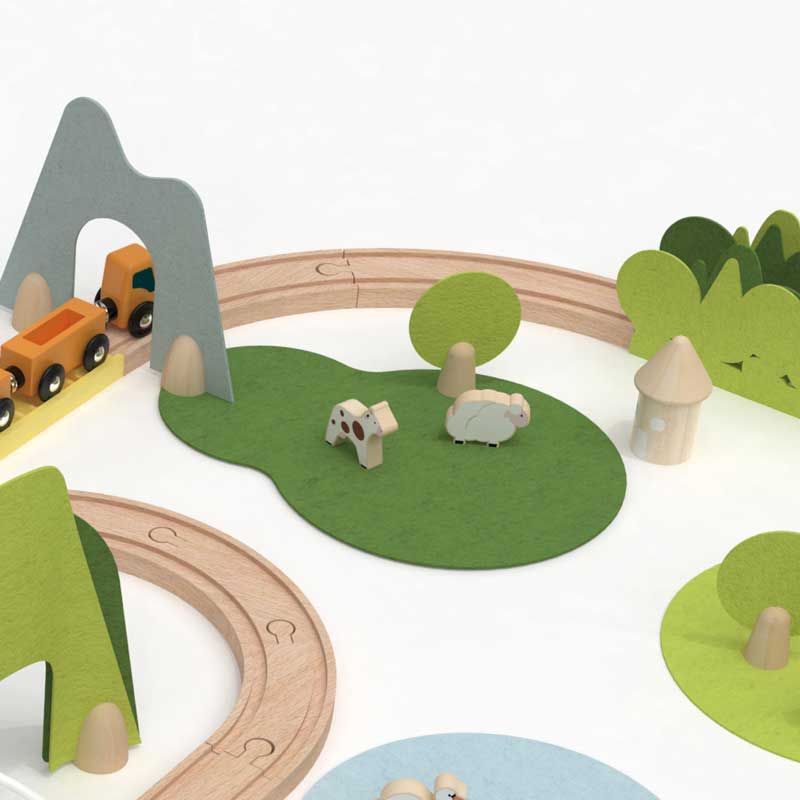 Комплектът е изработен от FSC-сертифицирано дърво и рециклиран филц (P.E.T.), което го прави едновременно здрав, безопасен и екосъобразен. Интерактивните зони като музикалния мост с ксилофон и виадукта с топчета добавят звукови и визуални ефекти, които правят играта още по-ангажираща.