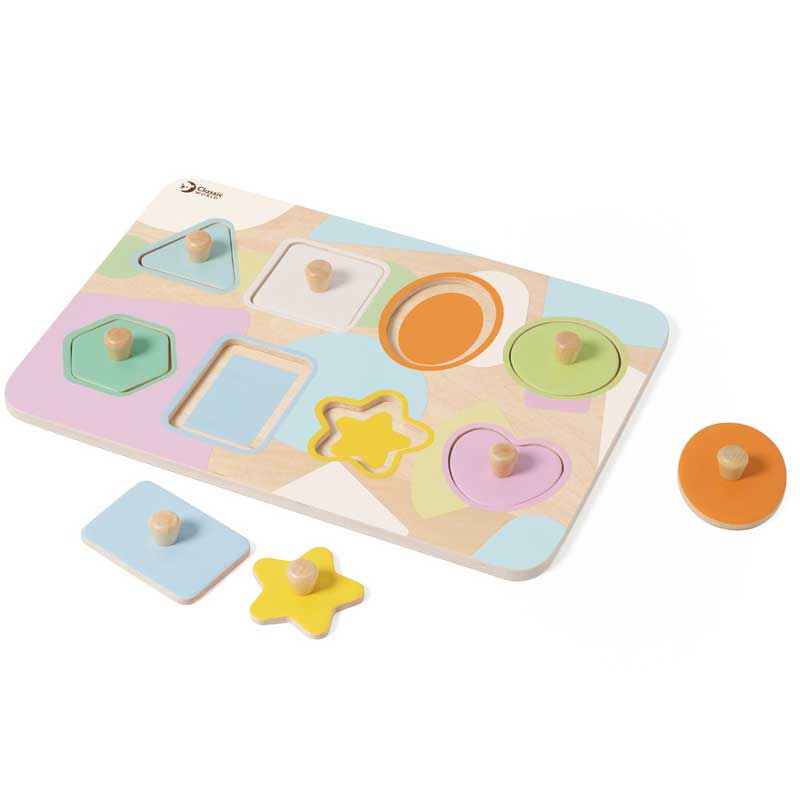 Този стилен дървен пъзел с дръжки е създаден, за да въведе децата в света на геометричните форми по забавен и интуитивен начин. Със своята стабилна основа и нежни пастелни нюанси, играчката комбинира естетика и функционалност в едно образователно преживяване.
