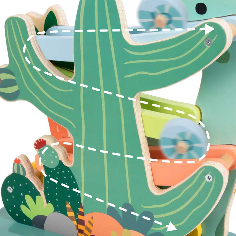 Формата на усмихнат динозавър, съчетана с природни мотиви, превръща всяка игра в малко приключение. Дървените елементи се плъзгат плавно по цветните улеи, а детето с интерес проследява движението им и постепенно осъзнава връзката между причина и резултат.