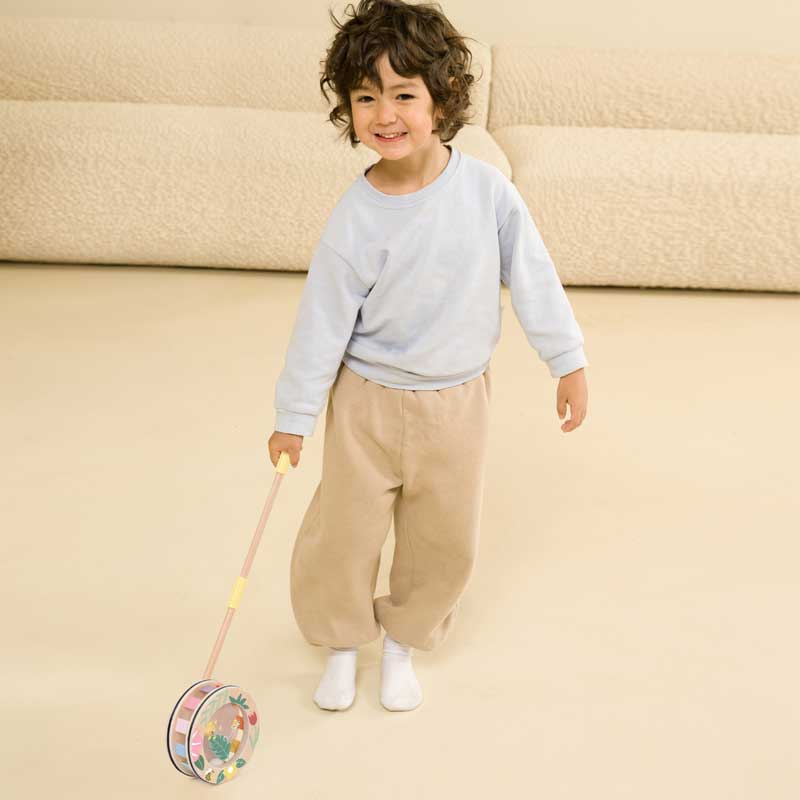 Тази стилна дървена играчка за бутане впечатлява с нежния си горски дизайн и внимателно подбраната цветова палитра. Колелото е декорирано с илюстрации на листа, цветя, пеперуда и пчеличка, които създават усещане за природа и спокойствие.