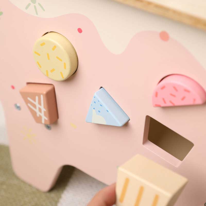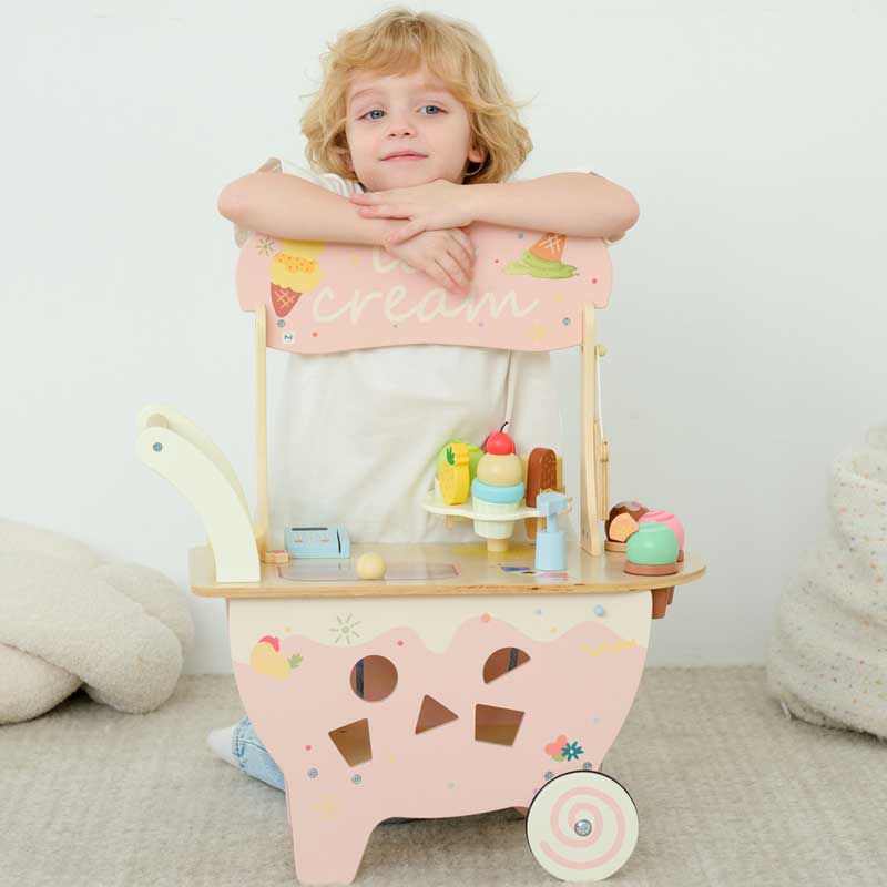 Кой каза, че иска сладолед! Тази очарователна дървена количка превръща всяка игра в истински летен празник. С нежния си пастелно-розов дизайн, красиви илюстрации и богато оборудване, тя приканва децата да влязат в ролята на малки търговци и да обслужват своите клиенти с усмивка.