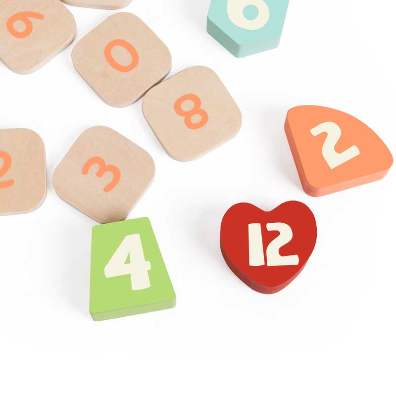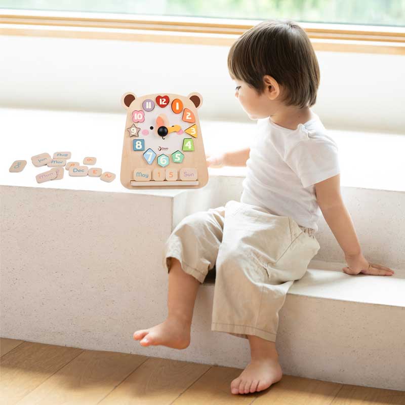 Часовникът разполага с подвижни цветни числа в различни форми, които се поставят върху основата като пъзел. Въртящите се стрелки помагат на детето да усвои часовете по забавен начин, а допълнителните плочки с месеци и дни от седмицата разширяват възможностите за игра и учене.