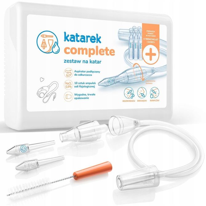 Aspiratorul conectat la un aspirator este o modalitate eficientă de a curăța nasul copilului dumneavoastră. Tot ce trebuie să faceți este să plasați vârful aspiratorului peste fiecare nară timp de câteva secunde și în câteva minute bebelușul dumneavoastră va simți o ușurare. Setul complet Katarek include și 10 fiole saline, care vor ajuta la subțierea secrețiilor și hidratarea nasului după procedură. Întregul set este închis într-o cutie robustă în care puteți transporta aspiratorul și micile accesorii necesare.