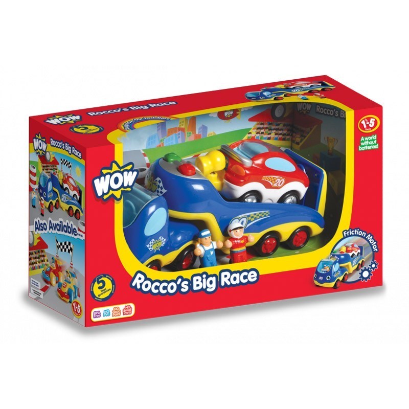 Această jucărie interactivă este fabricată de WOW Toys și permite copiilor să se implice în lumea curselor și să își dezvolte imaginația. Folosește-l pe Rocko pentru a conduce mașina de curse Axel pe pistă pentru o cursă unică. Deschide portbagajul și apasă butonul verde pentru a elibera mașina de curse, care trebuie să meargă pe pistă pentru cursă. Așează figurina pilot pe scaunul șoferului și îndreaptă-te spre linia de curse. Urmărește-l cum aleargă.